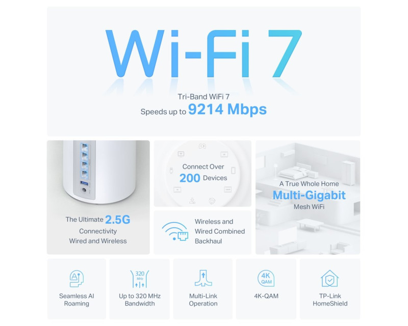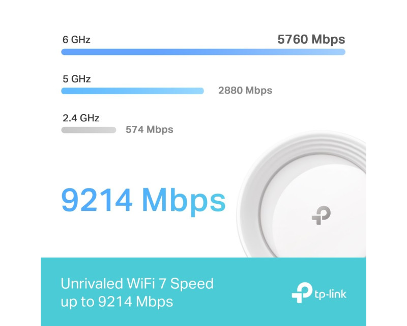 Router vám poskytne zrychlenou propustnost, vysoký výkon, nízkou latenci a silnou ochranu proti rušení. Je totiž vybavený technologií WiFi 7. Využívejte všechna tři pásma systému Whole Home WiFi 7 Mesh a dosáhněte rychlosti až 9 214 Mbps. Dopřejete si špičkový výkon bez přetížení sítě.