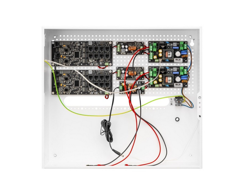 BCS power BCS power Zálohovaný PoE switch v boxu, celkový výkon 2x 72W, 16x RJ-45 PoEaf/at/passive max. 15/30/40W 10/100Mbps, 4x RJ-45 1Gbps, prostor pro 2x akumulátor max. 18Ah, nabíjecí proud 1A/2A (jumper), jack konektor 12VDC, stavové LED, 2x stavové výstupy, tamper, ochrana proti přetížení a zkratu, 400 x 450 x 140mm, IP20