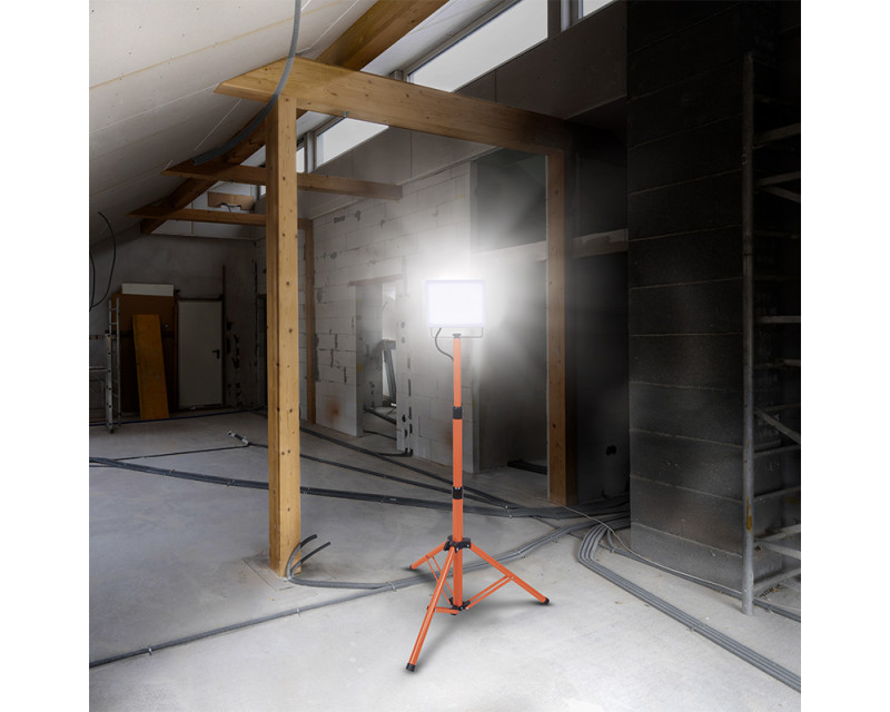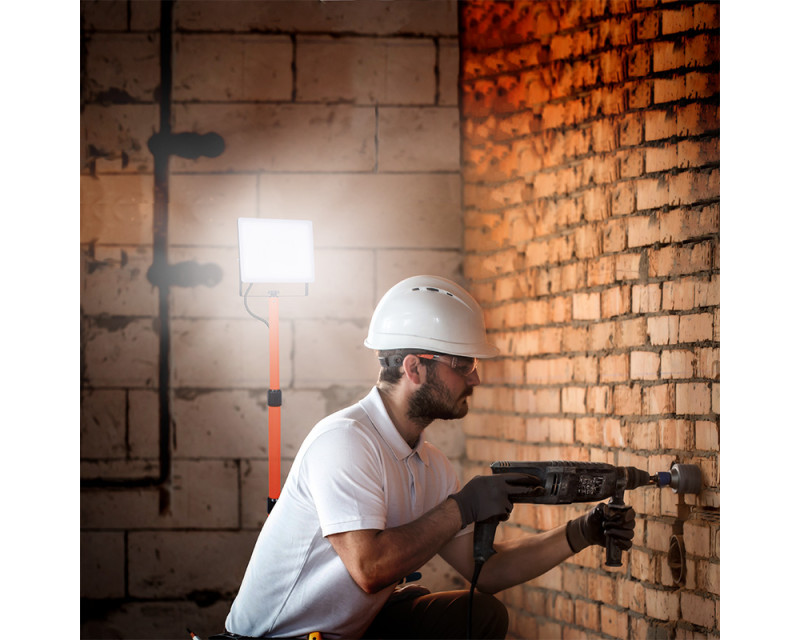 Díky výsuvnému teleskopickému stojanu (výška až 162 cm) je reflektor ideální pro stavby, dílny nebo venkovní akce. Odolné provedení z tlakově litého hliníku s krytím IP65 zaručuje ochranu proti vodě a prachu. Reflektor je vybaven přívodní šňůrou (1,5 m), životností LED 30 000 hodin a CRI > 80.