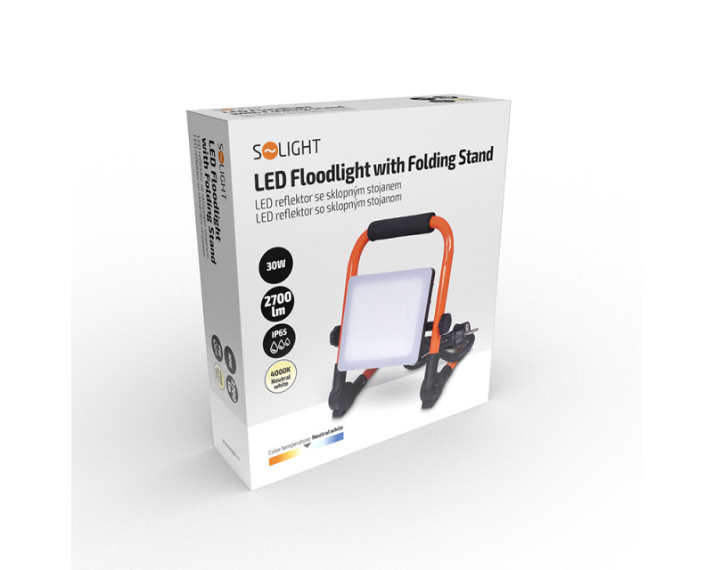 Solight LED reflektor se sklopným stojanem, 30W, 2700lm, 4000K, kabel se zástrčkou, IP65