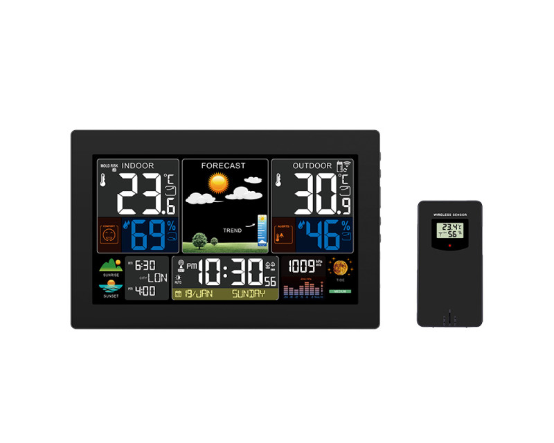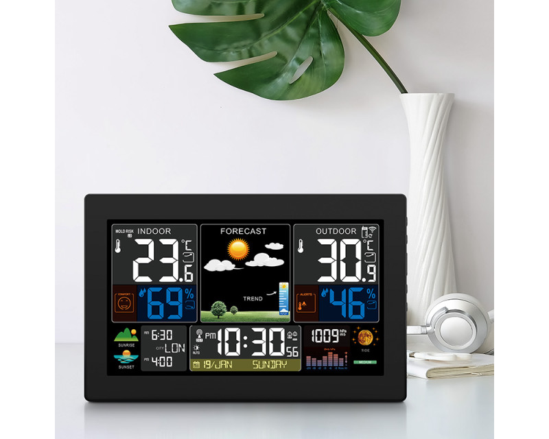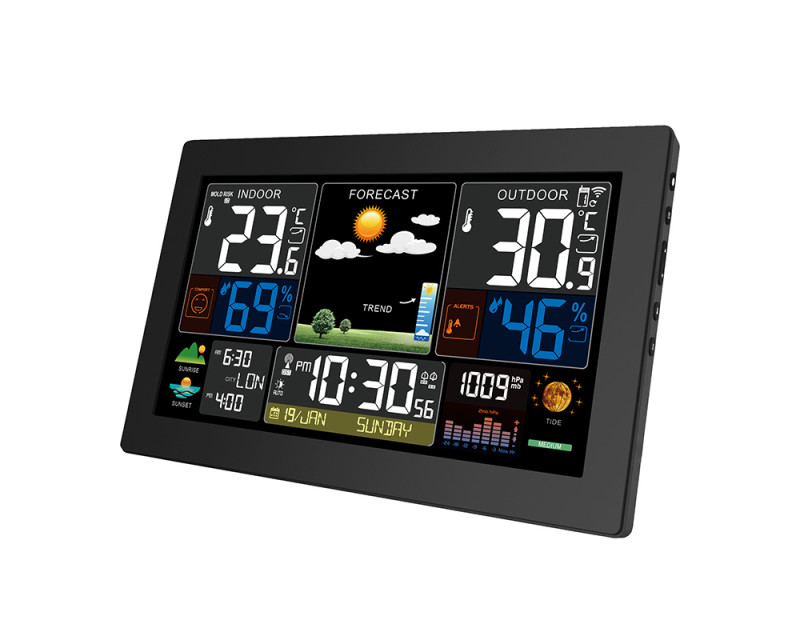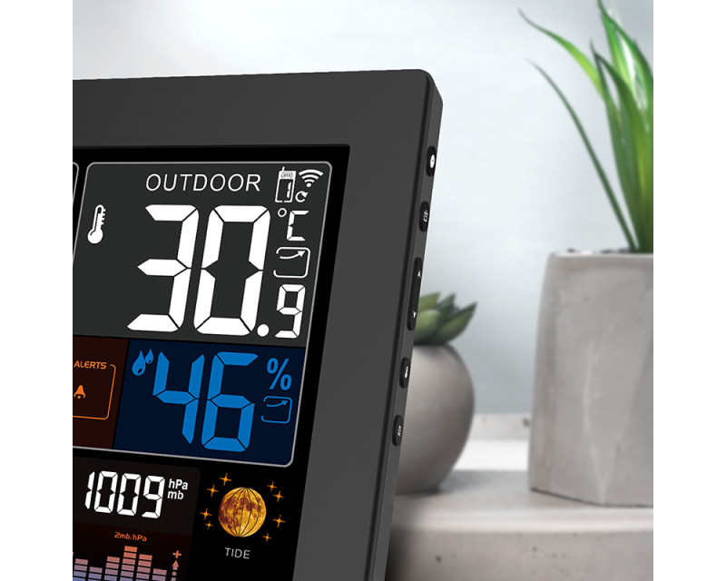 Tato meteostanice vyniká velkým, barevným a podsvíceným displejem o úhlopříčce 22,2 cm (19,3 × 11 cm), který umožňuje snadné a přehledné sledování všech naměřených hodnot i dalších funkcí. Díky jasné grafice a možnosti nastavení 5 úrovní podsvícení si můžete displej přizpůsobit podle svých potřeb a světelných podmínek v místnosti. Ovládání je navíc velmi intuitivní – dotykový senzor na horní hraně meteostanice umožňuje jednoduché rozsvícení displeje či odložení budíku pouhým dotykem. Displej zobrazuje nejen aktuální teplotu a vlhkost (vnitřní i venkovní), ale také předpověď počasí v 6 grafických úrovních, fáze Měsíce, východ a západ Slunce, atmosférický tlak a další užitečné informace. Díky svým rozměrům 22,5 × 14,5 × 3,3 cm se stane nepřehlédnutelným doplňkem vašeho interiéru, ať už ji umístíte na stůl pomocí praktického stojánku nebo ji připevníte na zeď. Přehlednost a snadné ovládání doplňuje také rychlý přístup k tlačítkům na boční straně meteostanice, což zajišťuje pohodlné nastavení a úpravu všech funkcí.