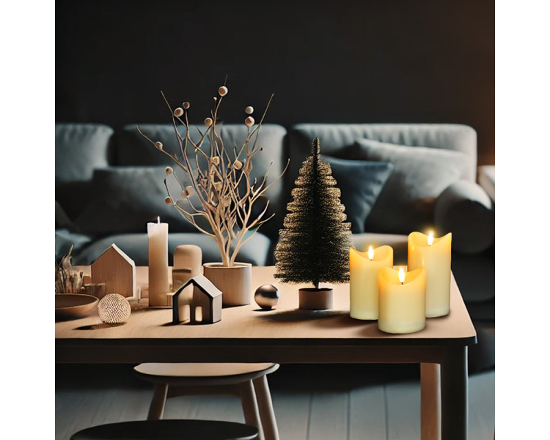 Tato sada tří voskových LED svíček nabízí realistickou náhradu klasických svíček bez rizika požáru. Každá svíčka má přirozeně blikající plamen, který věrně napodobuje skutečný oheň. Teple bílé světlo vytváří příjemnou, relaxační atmosféru, ideální pro večerní pohodu i sváteční stolování. Výšky svíček jsou 15, 12 a 10 cm, průměr 7,5 cm.