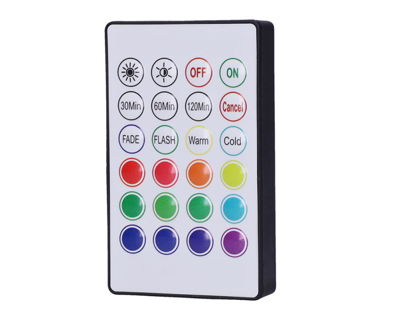 - funkce dálkového ovladače: zapnuto/vypnuto, stmívání, časovač, 15 barev, blikání, prolínání barev, zvukový senzor