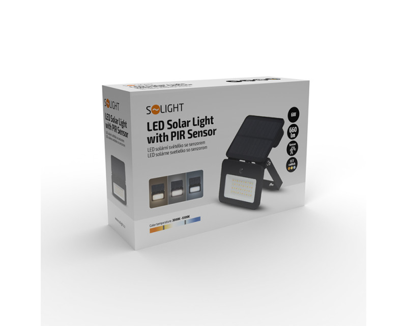 Solight LED solární reflektor se senzorem, 6W, 660lm, 3CCT, Li-Ion, černá