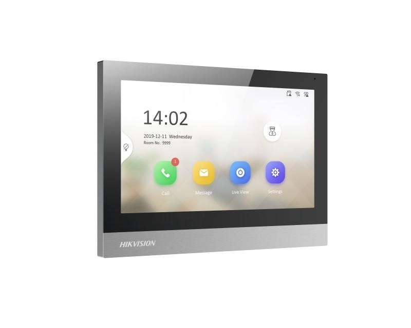 Vnitřní monitory HikVision 7" barevný TFT-LCD monitor pro videotelefony určený pro povrchovou instalaci na stěnu, dotykové ovládání, WiFi, rozlišení monitoru 1024 x 600px, vestavěný mikrofon a reproduktor, Hik-Connect, podpora TF karty max. 128GB, rozhraní RS-485, LAN port 10/100 Base, 8/4 alarm vstup/výstup, výstup 12VDC 0.5A, rozměry 178 x 126 x 22mm, provedení plast, napájení PoE/12VDC - 12W, zdroj není součástí