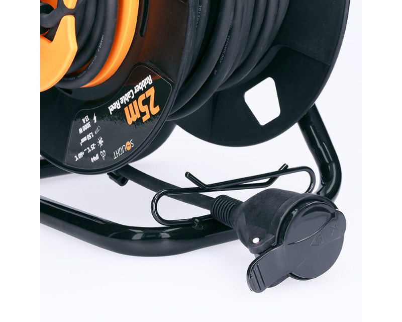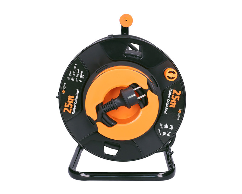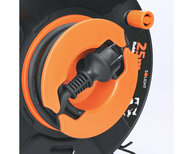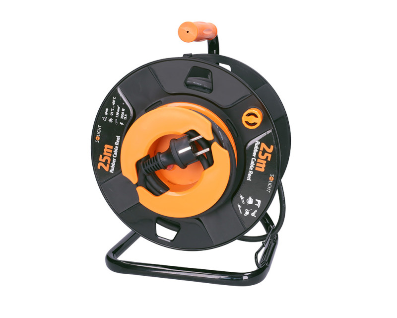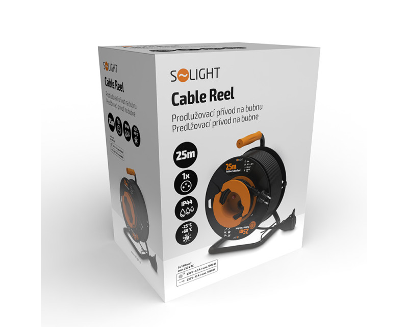 • Solight prodlužovací přívod na bubnu, 1 zásuvka, venkovní, 25m gumový kabel, 3x 1,5mm2, IP44