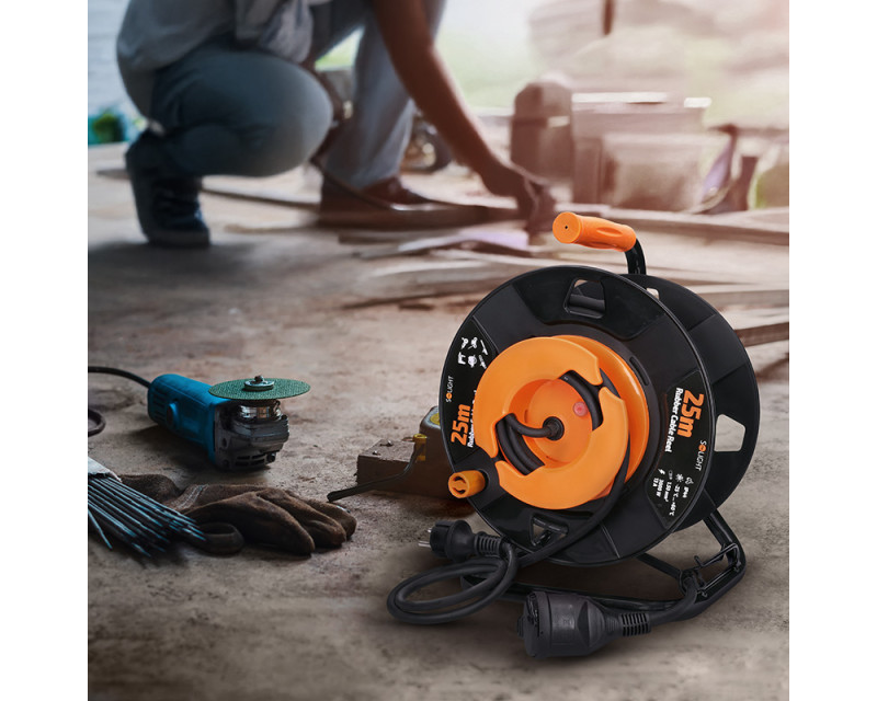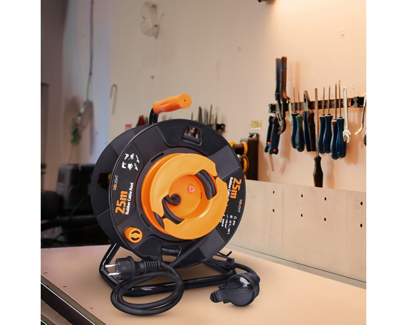 Prodlužovací kabel na navíjecím bubnu s délkou 25 metrů a jednou zásuvkou je ideální pro použití venku, na stavbách nebo v dílnách. Gumový kabel zajišťuje odolnost proti povětrnostním podmínkám a mechanickému namáhání. Produkt je navržen pro bezpečné a spolehlivé připojení stavebních, zahradních i méně náročných průmyslových zařízení.