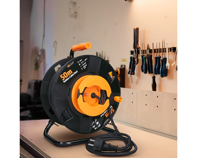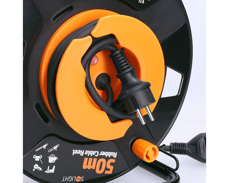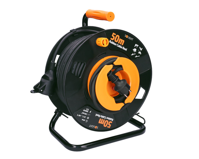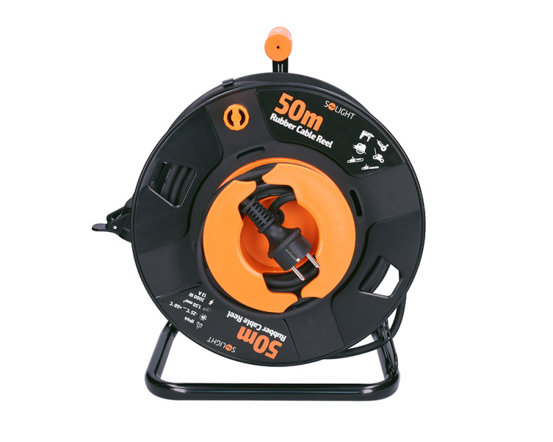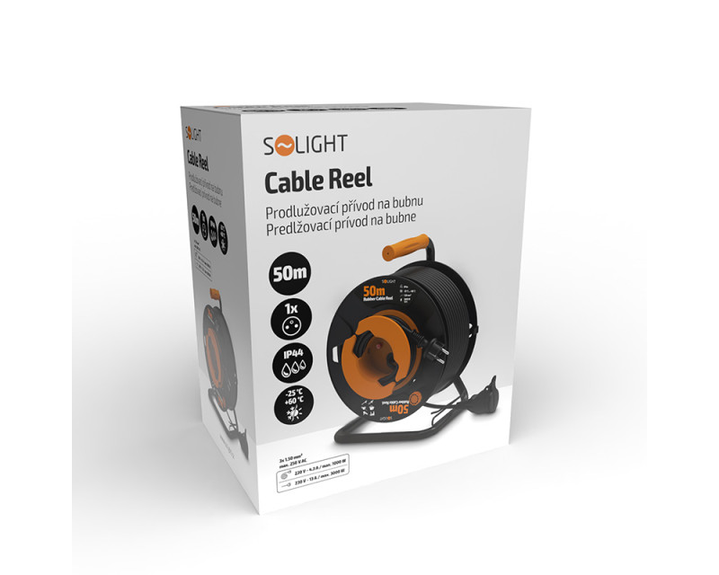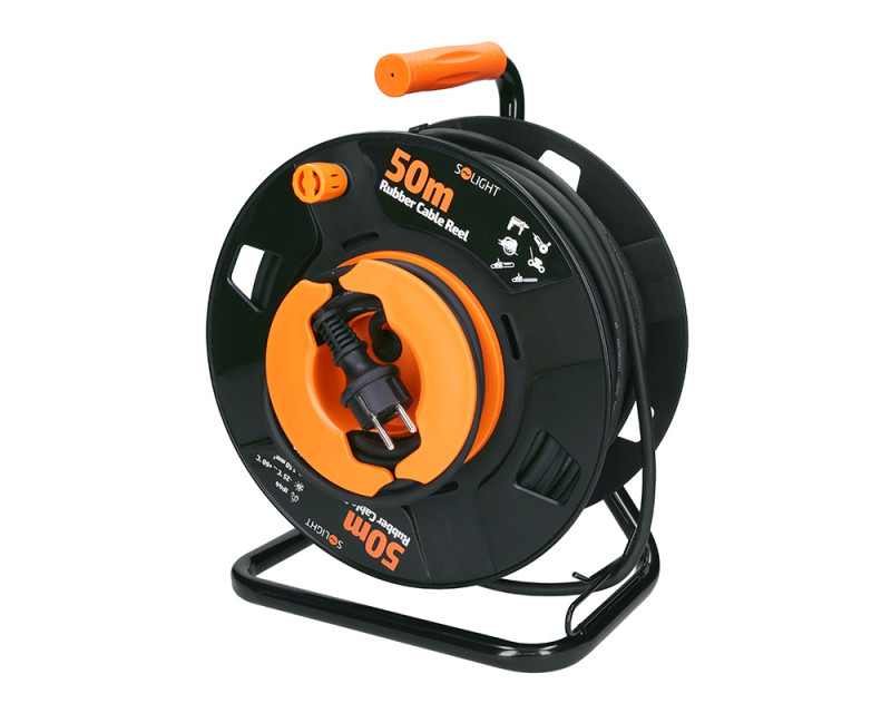 Solight prodlužovací přívod na bubnu, 1 zásuvka, venkovní, 50m gumový kabel, 3x 1,5mm2, IP44