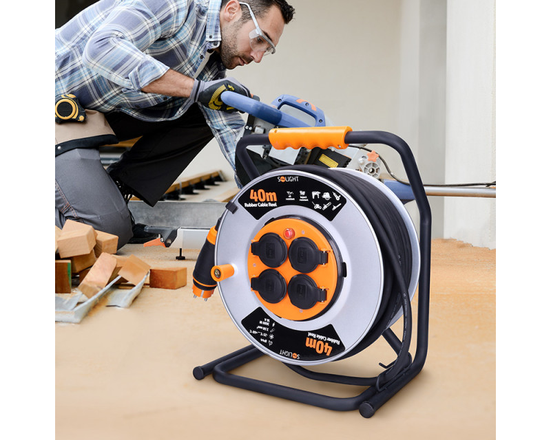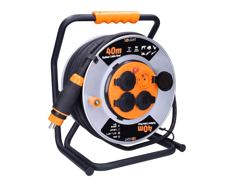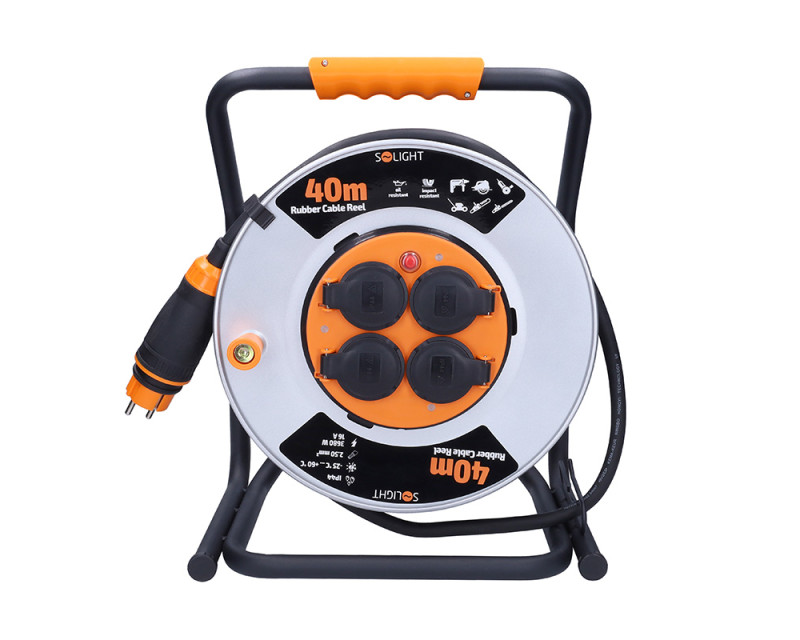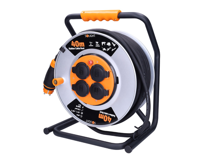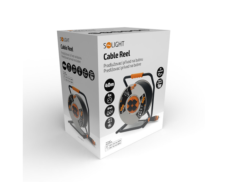 • Solight prodlužovací přívod - na kovovém bubnu, 4 zásuvky, 40m kabel guma-neopren, 3x 2,5mm2, IP44