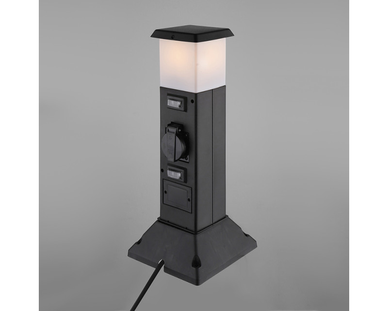 Dvě zásuvky s dětskými pojistkami a krytkami proti vlhkosti a prachu umožňují bezpečné připojení zahradní techniky, grilu nebo čerpadla. Každá zásuvka i světlo mají svůj vlastní vypínač pro pohodlné ovládání. Matná černá barva v kombinaci s černými krytkami zásuvek působí nenápadně a elegantně. Plastové tělo s krytím IP44 je odolné vůči vlhkosti i prachu. Do světla můžete vložit standardní LED žárovku s paticí E14. Ideální řešení pro stylové a bezpečné venkovní napájení.