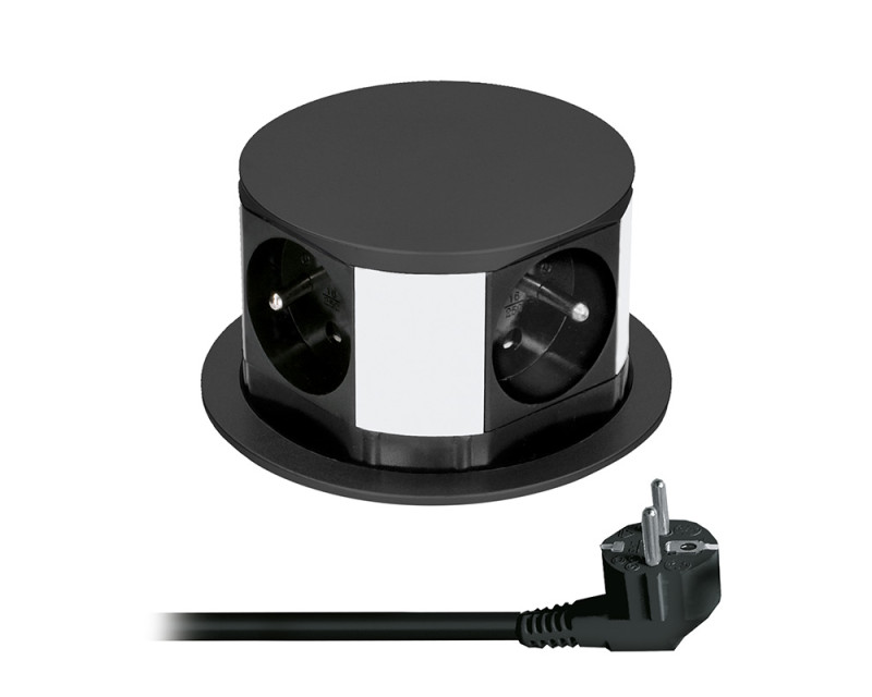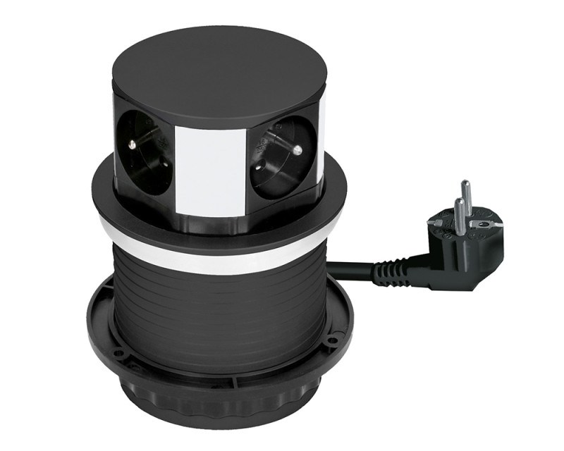 Výsuvný blok zásuvek se čtyřmi 230V zásuvkami přináší praktické a designově čisté řešení napájení přímo do pracovní plochy. Kruhové tělo umožňuje pohodlný přístup ze všech stran, ideální pro pracovní stoly, kuchyňské linky nebo konferenční místnosti. Výsuvný mechanismus chrání zásuvky před nečistotami a neruší celkový vzhled interiéru.