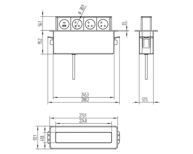 Součástí bloku je PVC kabel s délkou 2 metry a úhlovou vidlicí s nízkým profilem. Pro montáž je nutný otvor o rozměru 246 × 58 mm. Výsuvný mechanismus blokuje ve vysunuté poloze 60 mm nad deskou a pod deskou zabírá 94 mm.