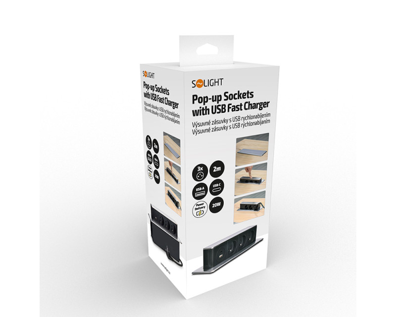Solight 3z + USB A+C 20W PD výsuvný blok zásuvek, 2m, nerez ocel