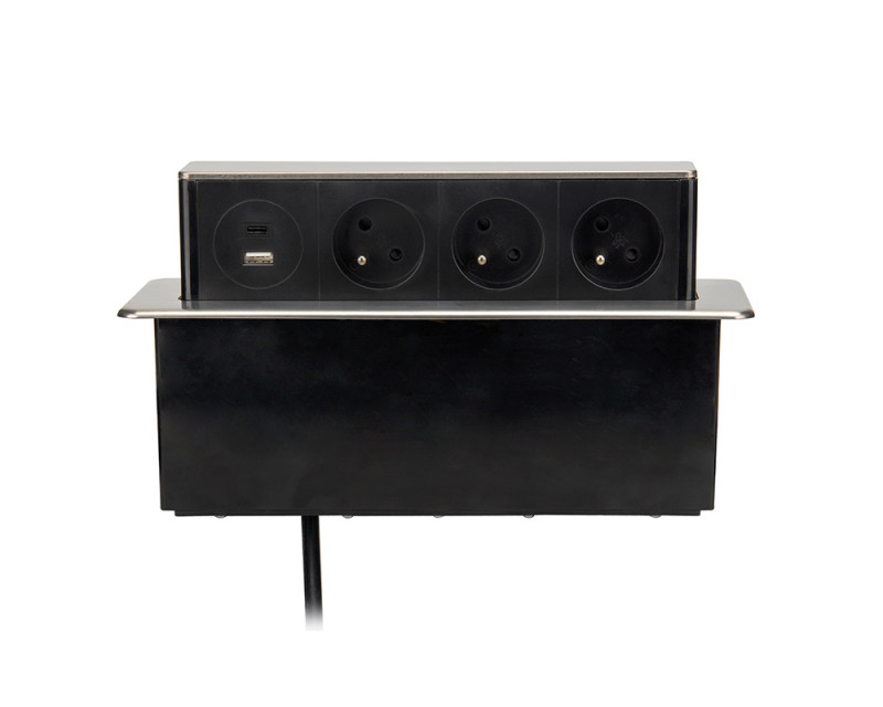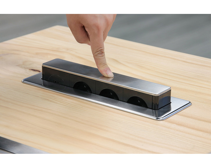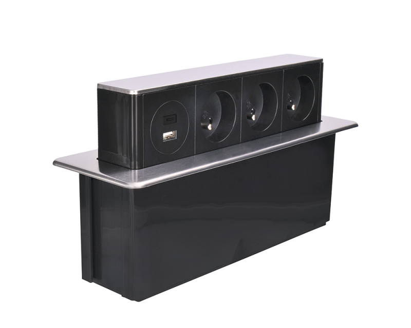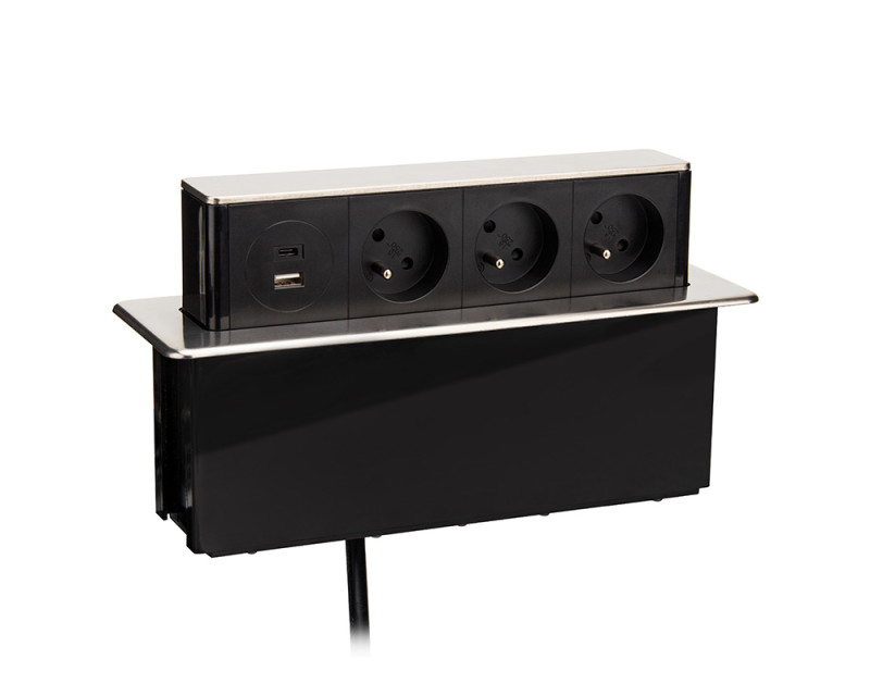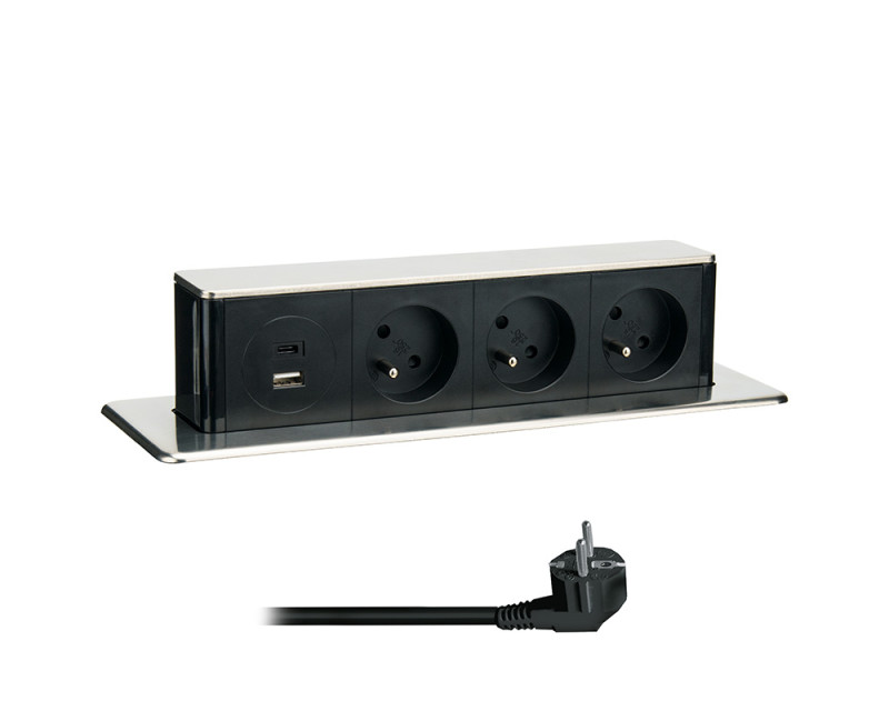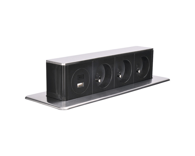 Výsuvný blok se zásuvkami je praktickým doplňkem pro pracovní desky a stoly, který umožňuje snadný přístup k elektrickým přípojkám pouze tehdy, když je to potřeba. Díky tomu šetří místo a udržuje pracovní plochu přehlednou. Vrchní kryt z nerezové oceli ve stříbrné barvě dodává moderní vzhled a zajišťuje odolnost vůči každodennímu používání.