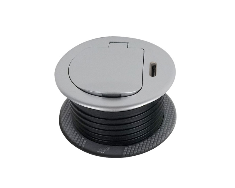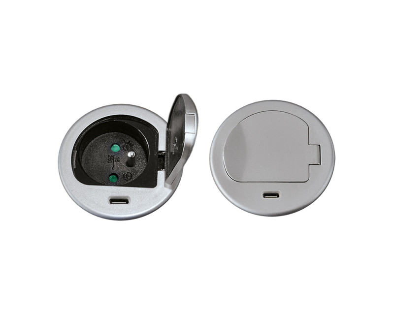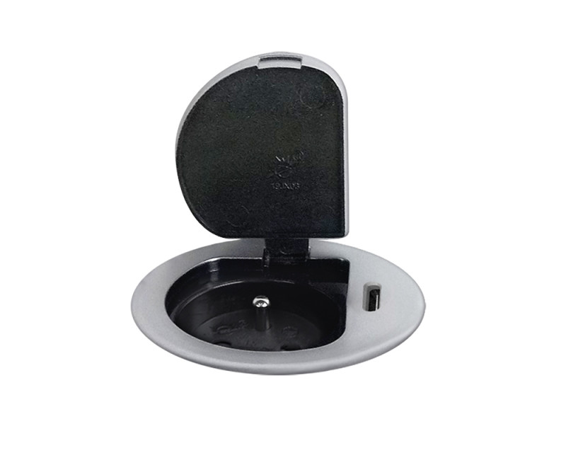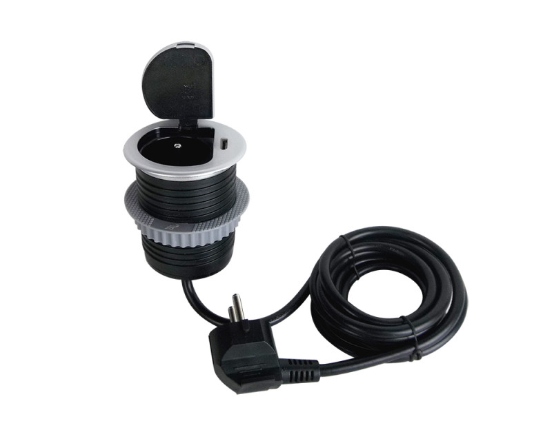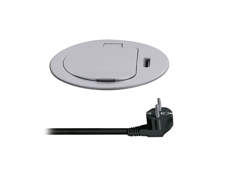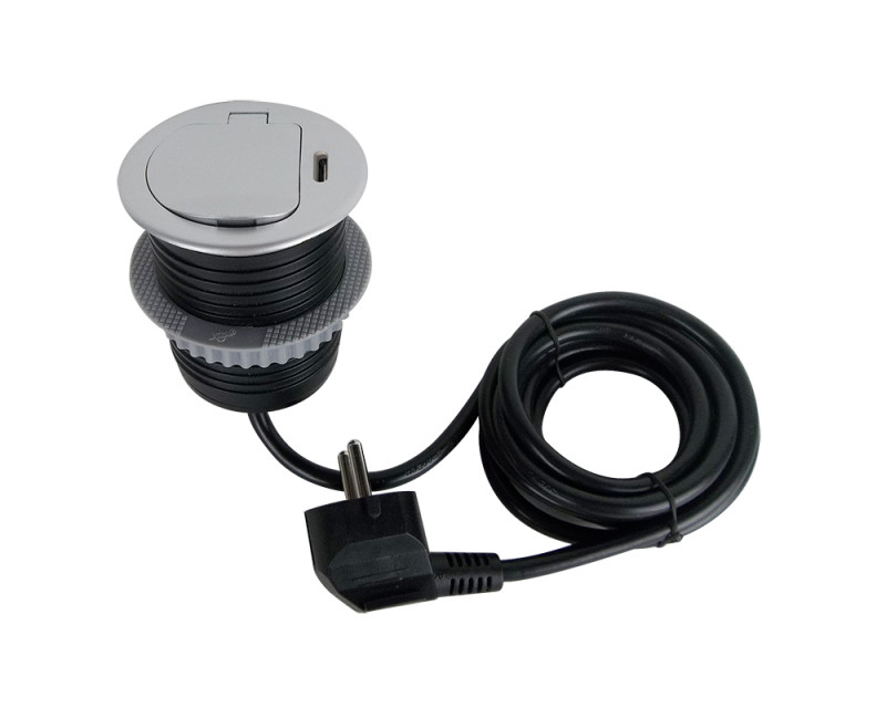 Zásuvka se instaluje do otvoru v pracovní desce a fixuje pomocí šroubovacího mechanismu. Nízký profil a stříbrné víčko umožňují snadné začlenění do moderního interiéru bez rušivých prvků. Po instalaci zůstává povrch čistý a přehledný, zásuvka je kdykoliv okamžitě k dispozici.