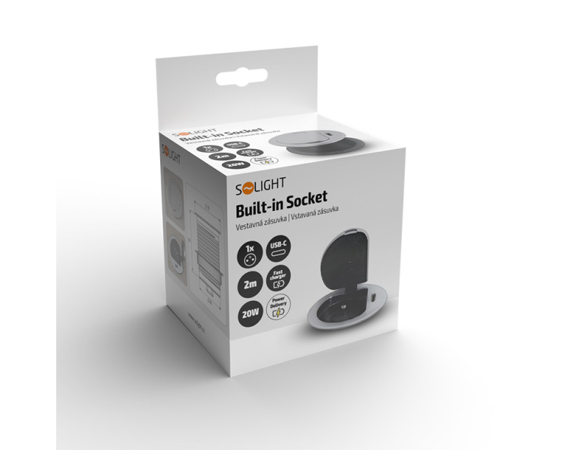 Solight 1z + USB-C 20W PD vestavná zásuvka, 2m, stříbrná