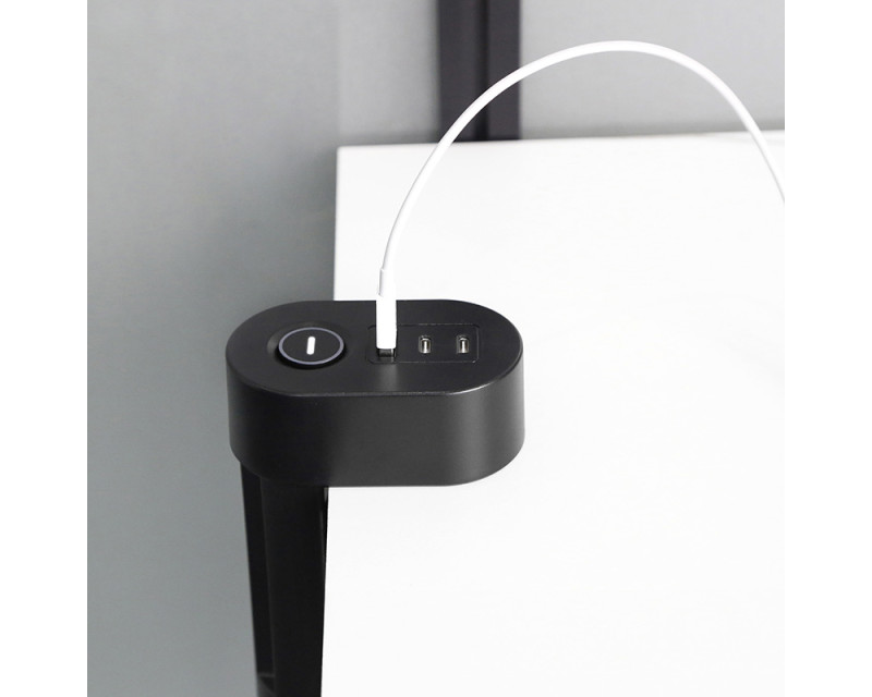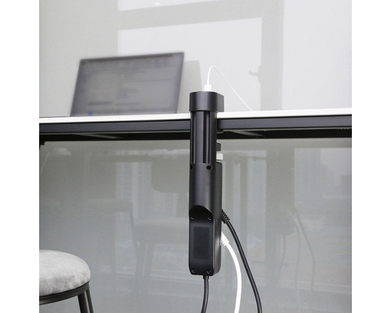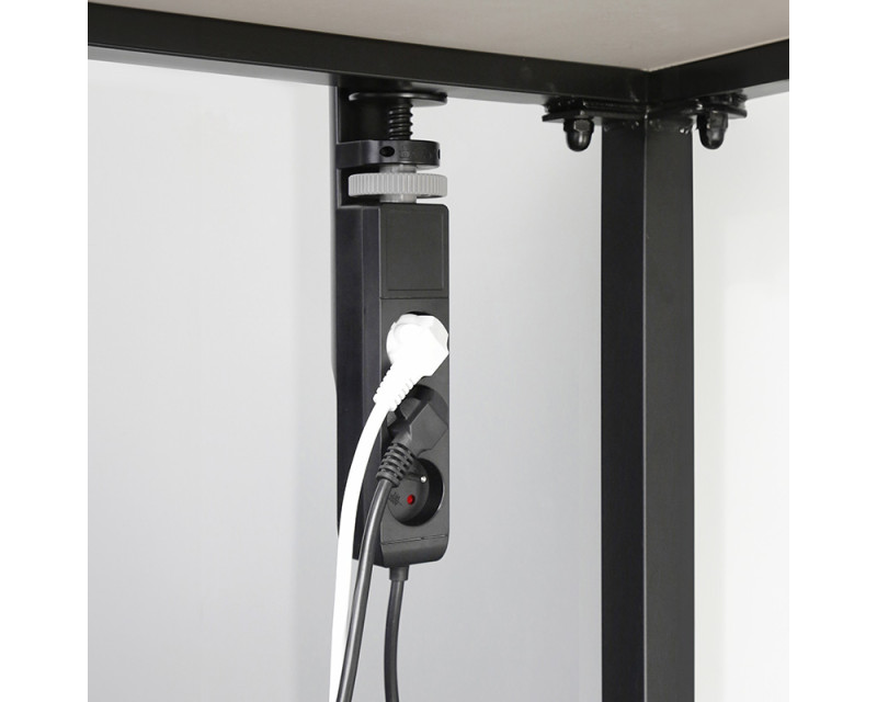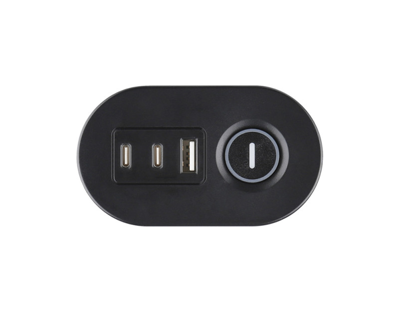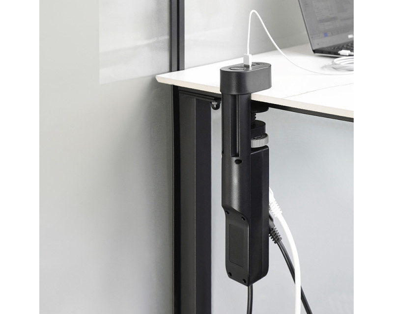 Nabíjecí porty USB-A a USB-C s podporou rychlého nabíjení jsou umístěny na čele prodlužovacího přívodu, a jsou tak snadno dostupné přímo z pracovní plochy. Tři zásuvky 230V jsou elegantně ukryté pod hranou stolu, takže nenarušují vizuální čistotu a nepřekáží na pracovním místě. Zásuvkový blok lze v případě potřeby namontovat i obráceně – zásuvkami vzhůru.