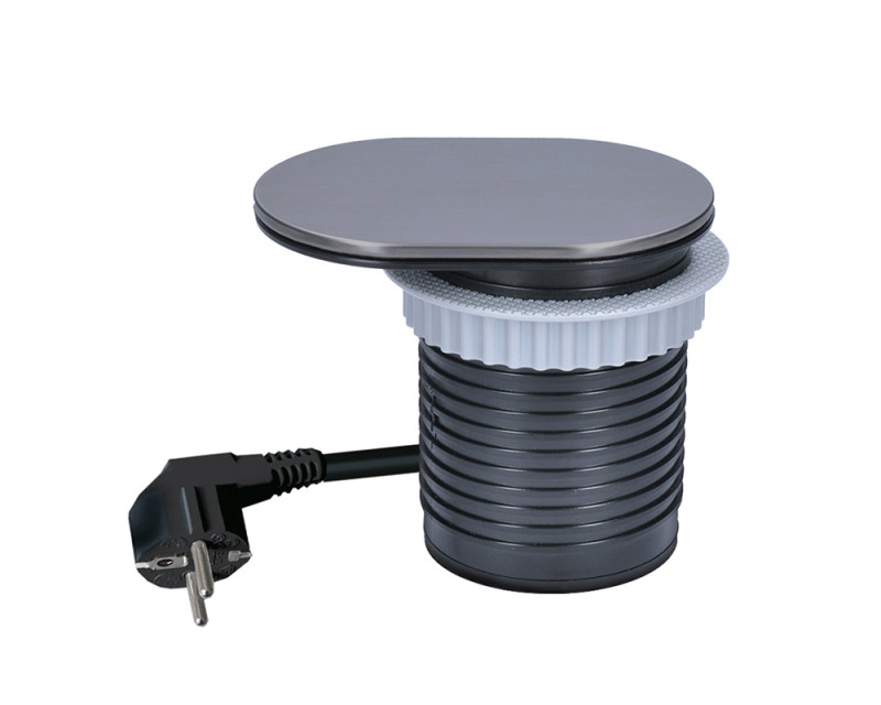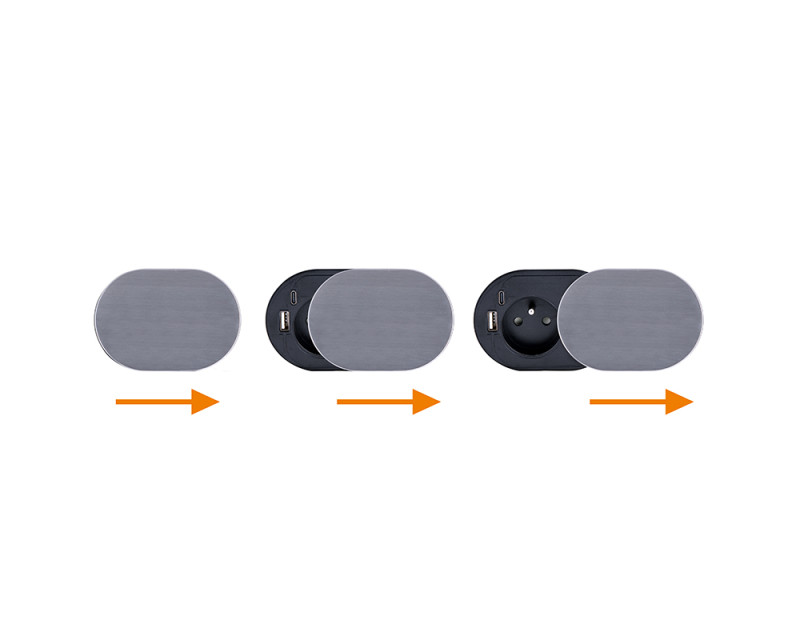 Posuvné víčko v matném nerez provedení působí elegantně a nenápadně. Posuvný mechanismus chrání zásuvku i nabíjecí porty před prachem a nečistotami. Navíc lze odhalit jen USB porty a síťovou zásuvku ponechat zakrytou. Zakryté víčko zachovává čistý vzhled pracovní plochy.