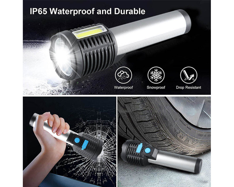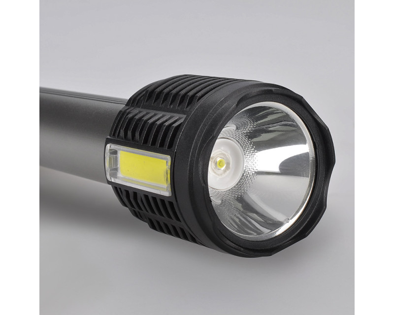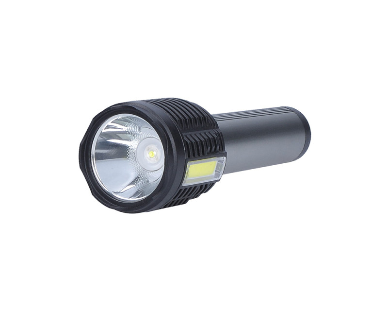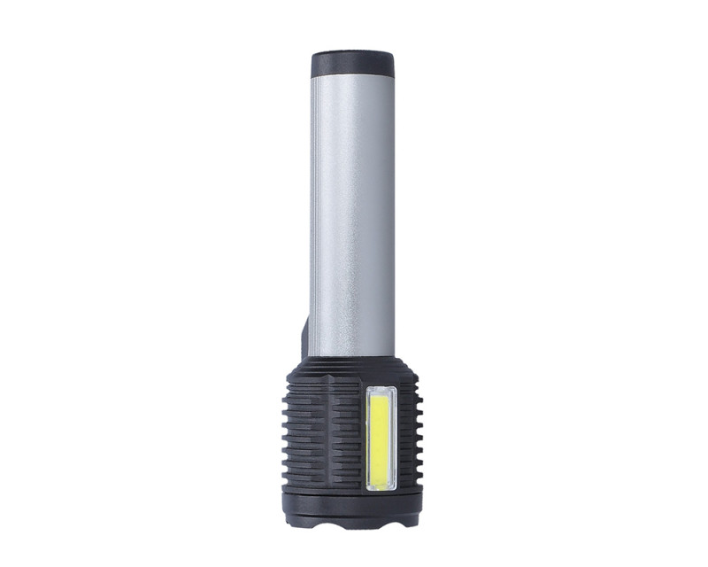 Ruční LED svítilna s kombinací předního 3W LED a bočního 3W COB světla poskytuje svítivost 150 + 150 lm a nabízí čtyři režimy svícení. Akumulátor 1200mAh zajišťuje provoz 3–6 hodin, nabíjení trvá cca 4 hodiny přes micro USB (kabel součástí). Odolná proti stříkající vodě (IP44), s rozměry 150 x 45 mm a kombinací hliníku a plastu je ideální pro každodenní použití. Dvoubarevné provedení (černá/stříbrná) doplňuje funkční a elegantní design.