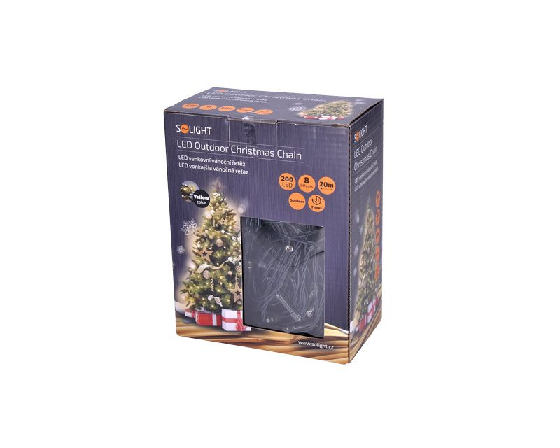 Solight LED venkovní vánoční řetěz, 200 LED, 20m, přívod 5m, 8 funkcí, časovač, IP44, teplá bílá