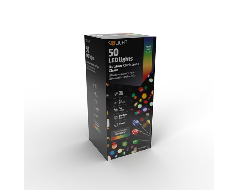 Solight LED venkovní vánoční řetěz, 50 LED, 5m, přívod 3m, 8 funkcí, časovač, IP44, vícebarevný