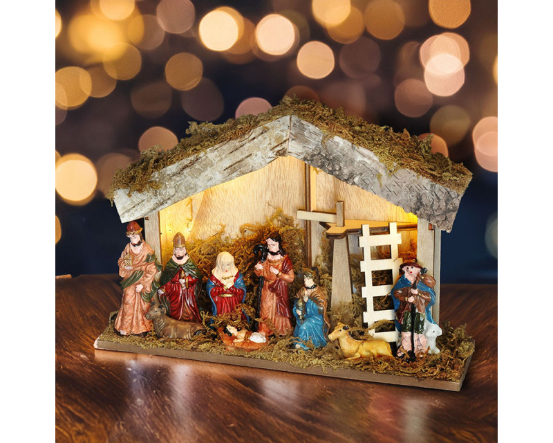 Betlém s barevnými postavičkami a teplým bílým LED osvětlením nabízí veselý a živý pohled na tradiční vánoční scénu. Šest LED diod decentně prosvětluje interiér betléma a dodává celé scéně útulné světlo. Rozměry 27 × 7 × 17 cm jsou ideální pro menší stoly, okenní parapety nebo jako součást větší dekorace.