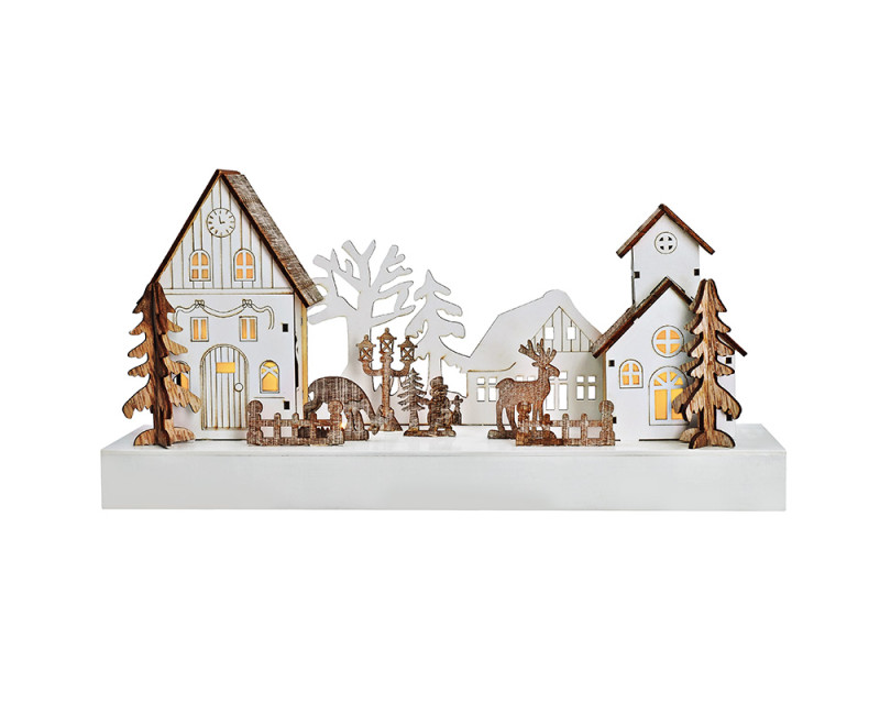 Tato dřevěná dekorace v podobě malebné vánoční vesničky nabízí jemné osvětlení pomocí čtyř LED diod s teplou bílou barvou. Propracované detaily domků a stromečků v kombinaci s přírodními materiály působí útulně a tradičně. Rozměry 34 × 8 × 17 cm ji činí ideální pro použití na poličku, parapet nebo komodu.