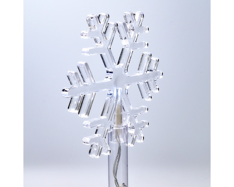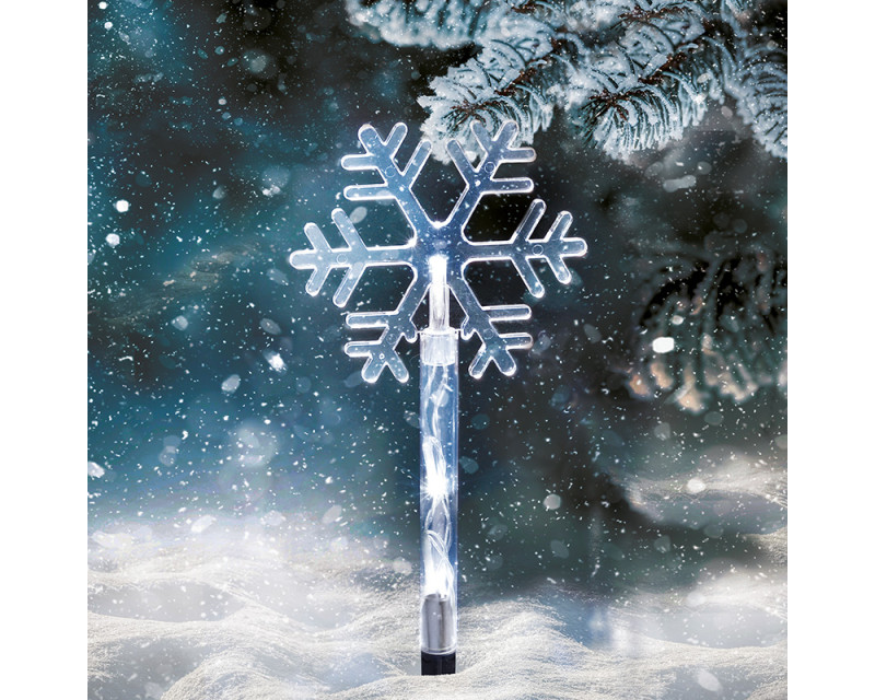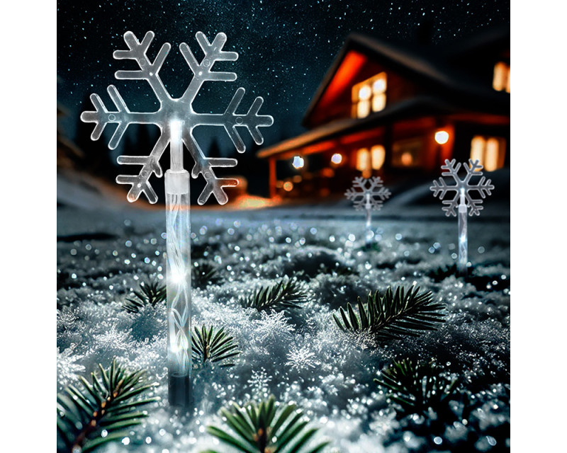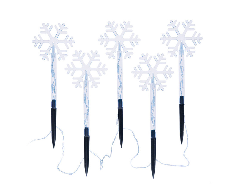 Vytvořte zimní pohádku na své zahradě pomocí těchto LED zapichovacích dekorací ve tvaru sněhových vloček. Sada obsahuje 5 vloček s celkem 15 LED diodami, které září studeným bílým světlem a krásně vyniknou v trávníku, květináčích nebo kolem chodníku. Výška vloček je 35 cm a celková délka osvětlení činí 140 cm, doplněná o 50cm přívodní kabel.