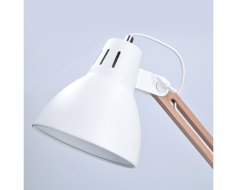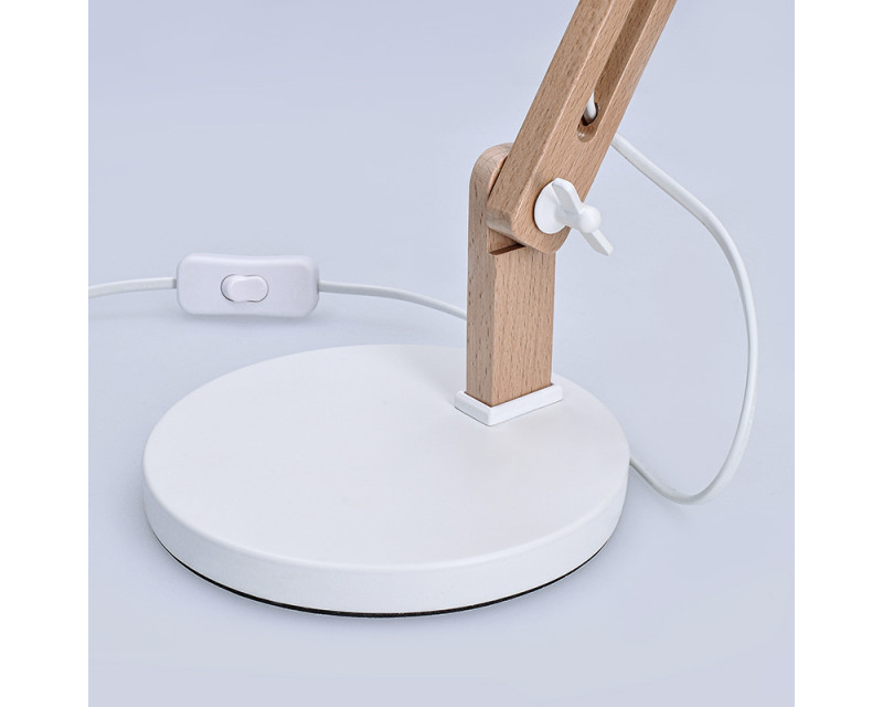 Ramena jsou plně nastavitelná – celková délka 10 + 25 + 25 cm – a umožňují přesné nasměrování světla. Průměr kovové základny je 17 cm, rozměr stínidla 15,5 x 16,5 cm. Díky přívodnímu kabelu o délce 150 cm s vypínačem je manipulace s lampou snadná. Ideální jako dekorativní i pracovní světlo. Barva: přírodní dřevo + matná bílá. Napětí: 230V.