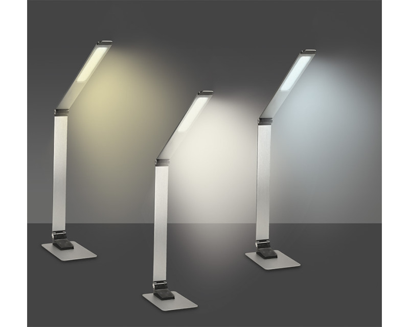 Prémiová stolní lampička z broušeného hliníku spojuje elegantní vzhled s výkonným a flexibilním osvětlením. Uživatel si může zvolit teplotu světla mezi 3000K, 4500K a 6000K a přizpůsobit tak osvětlení svým potřebám. Díky třístupňovému stmívání je možné regulovat intenzitu světla jednoduše dotykem prstu.