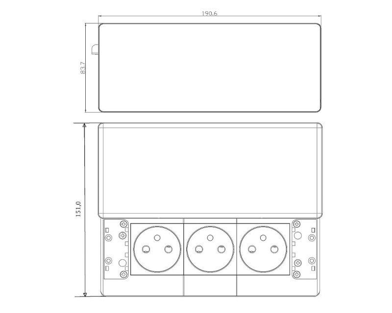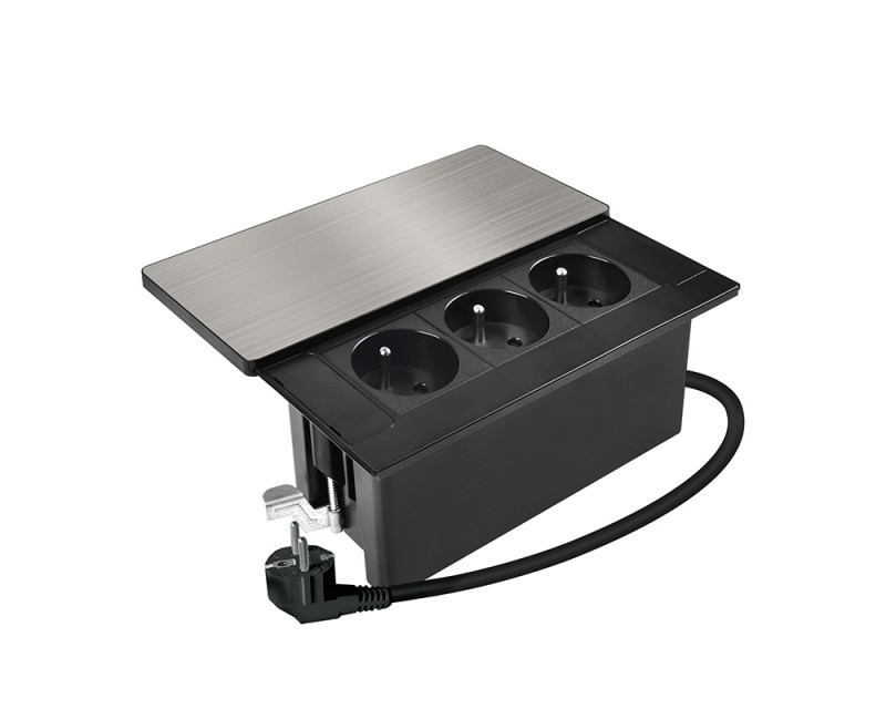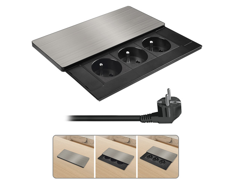 Vestavný blok zásuvek přivádí elektrickou energii přímo do pracovního stolu nebo kuchyňské linky. Tři zásuvky 230 V s dětskými pojistkami jsou schované pod decentním posuvným krytem, který chrání vnitřek před prachem a nečistotami. Napájecí kabel o délce 2m plně dostačuje pro běžné umístění v pracovních deskách a stolech.