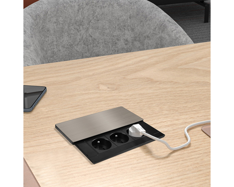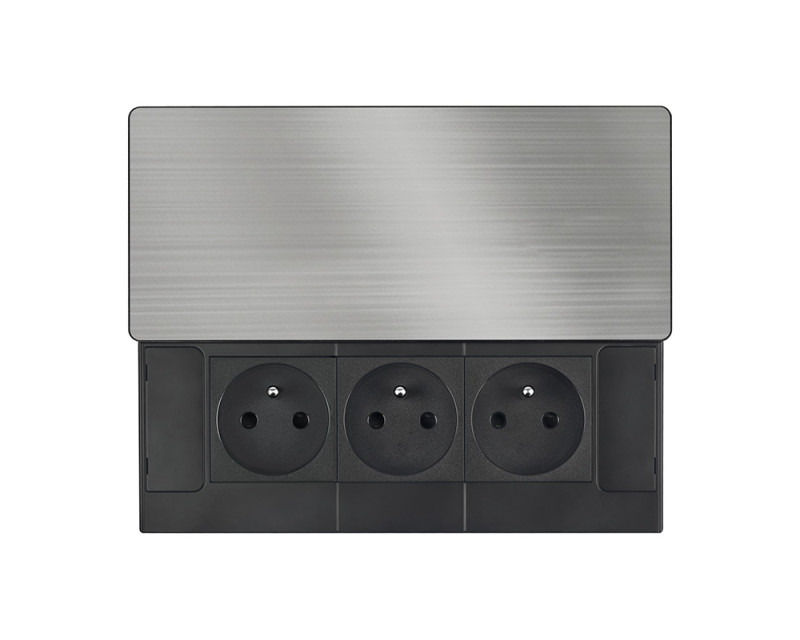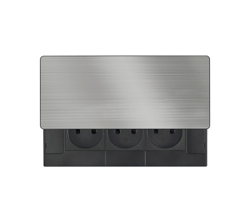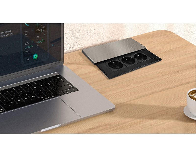 Vrchní kryt z matné tmavé nerez oceli (inox) působí elegantně a snadno se začlení do jakéhokoliv moderního interiéru. Nízký profil a posuvné otevírání šetří místo a nenarušují vzhled pracovní plochy. Ovládání je jednoduché, kryt stačí posunout a zásuvky jsou ihned k dispozici.