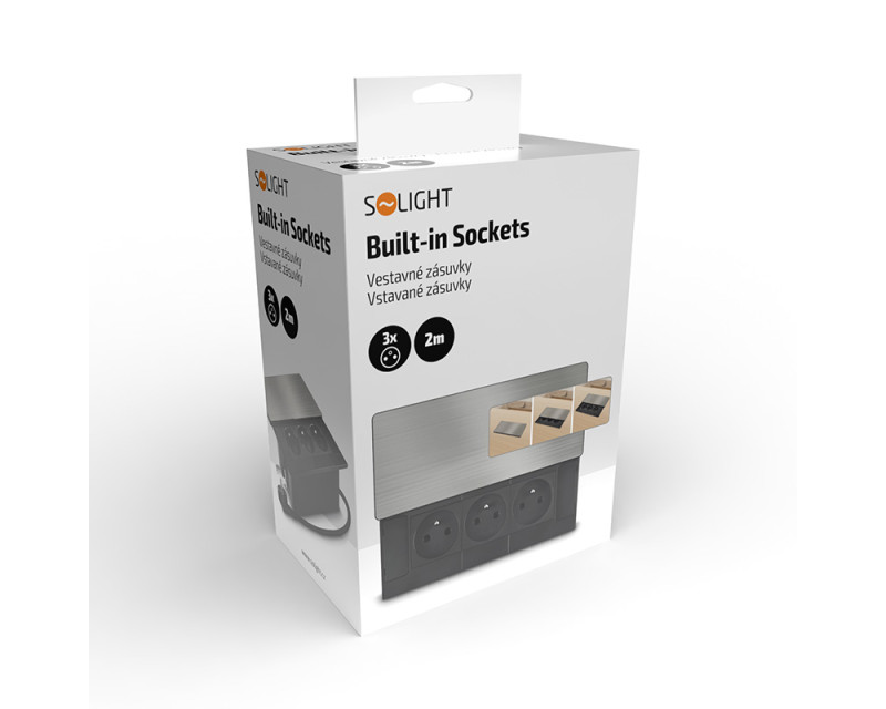 • Solight vestavný blok zásuvek s posuvným krytem, 3 zásuvky, 2m, stříbrný