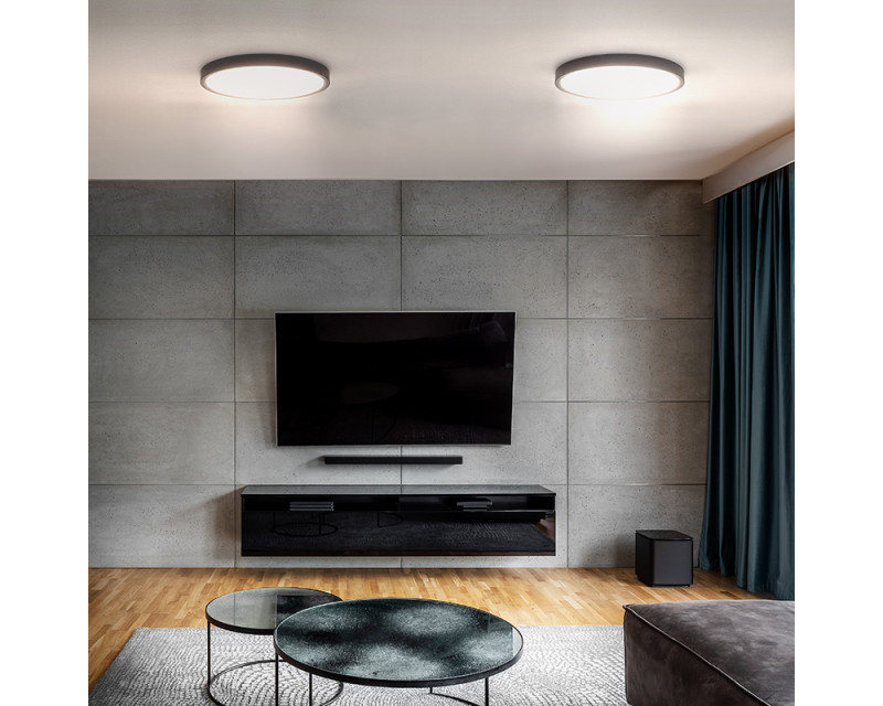 LED stropní svítidlo Estela v černém tenkém provedení je ideálním řešením pro moderní interiéry. Díky dálkovému ovladači můžete plynule regulovat jas, měnit barevnou teplotu světla (3000K–6500K) a volit mezi přednastavenými režimy. Maximální příkon 36W a světelný tok až 2700 lm (při 4000K) zajišťují dostatek světla pro každodenní použití.