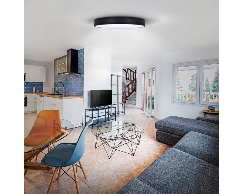 LED technologie s životností 20 000 hodin zajistí dlouhodobý provoz bez nutnosti časté výměny. Kvalitní podání barev (Ra > 80) zajišťuje přirozený vzhled osvětlených předmětů. Tělo z kombinace kovu a plastu, krytí IP20 a elegantní černý design o průměru 400 mm dodávají svítidlu moderní vzhled. Energetická třída G a široké provozní teplotní rozpětí od -20 °C do +50 °C z něj činí praktické a spolehlivé řešení pro každodenní použití.