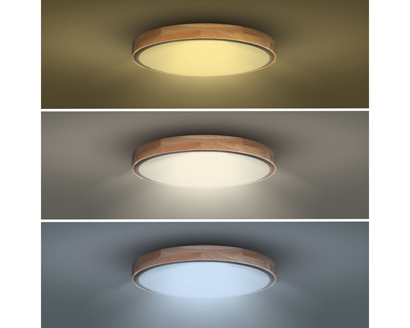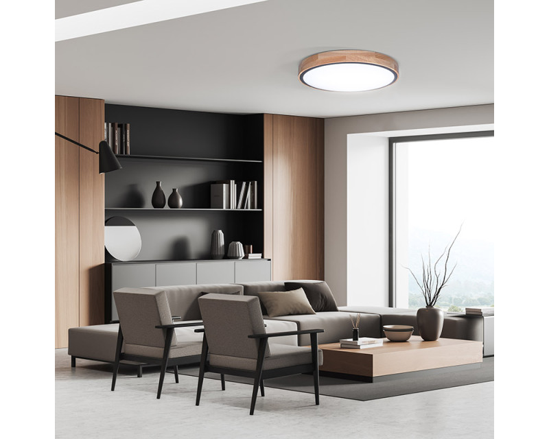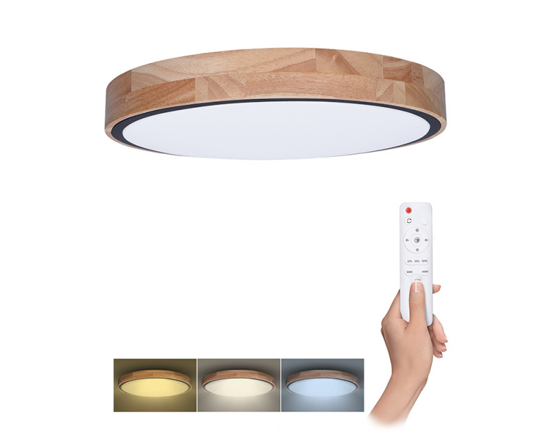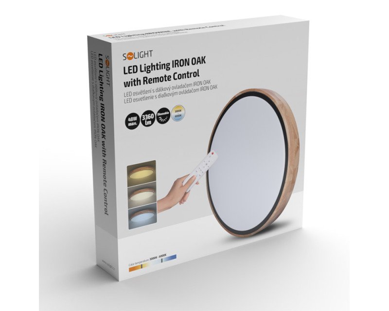 Luxusní LED stmívatelné svítidlo Iron Oak spojuje přírodní estetiku masivního dubu s moderní technologií. Osvětlení je vybaveno dálkovým ovládáním, které umožňuje volbu barevné teploty v rozsahu 3000K–6500K, plynulé stmívání i přepínání mezi světelnými režimy. Maximální příkon činí 48 W, světelný tok dosahuje až 3360 lm (pro 4000K).