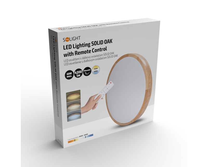 Solid Oak ve verzi 60 W je určen pro ty, kteří potřebují silnější světelný výkon – až 4200 lm při neutrální bílé (4000K). Teplotu světla lze přepínat mezi 3000K, 4000K a 6500K, a světlo plynule stmívat podle nálady nebo denní doby. Ovládání je zajištěno dálkovým ovladačem, který je součástí balení.