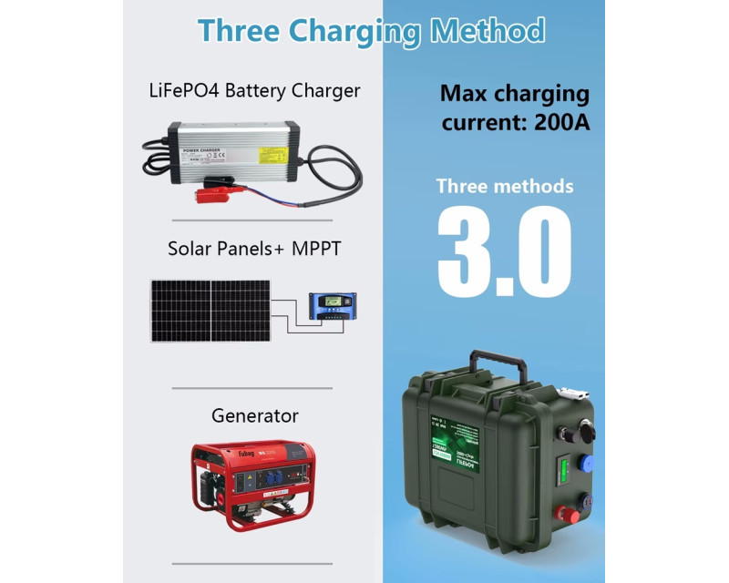 Nabíjecí baterie LiFePO4 12V 200Ah - lithium-železo fosfátová baterie má větší výkon, menší hmotnost a vydrží mnohem déle než olověná baterie. Extrémně bezpečná s velmi nízkou toxicitou pro životní prostředí. Baterie je umístěna v pouzdře z voděodolného materiálu ABS. Speciálně navržený inteligentní systém BMS inteligentně řídí a monitoruje provozní podmínky baterie, čímž zajišťuje, že baterie funguje v bezpečném prostředí, zajišťuje dlouhou životnost a efektivní provoz. Je možné zapojit několik baterií do série nebo paralelně (až 4 kusy), což je vhodné pro vysoce energeticky náročné aplikace.