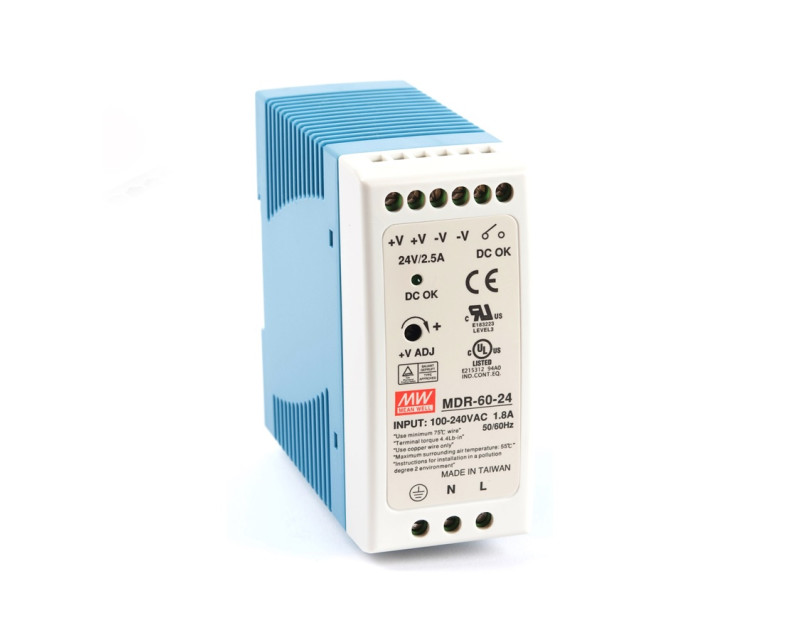 Profesionální spínaný napájecí zdroj Mean Well na DIN lištu s rozšířeným rozsahem provozních teplot s výstupním napětím 24V a výstupním proudem 60W pro aktivní prvky s odpovídajícím napájecím rozsahem.