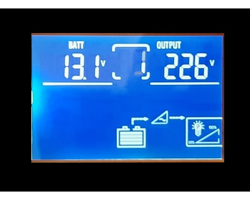 - LCD displej zobrazuje provozní a chybový stav (vstupní napětí, výstupní napětí, výstupní výkon, úroveň kapacity baterií, úroveň zatížení, kód rozhraní a kód poruchy)
