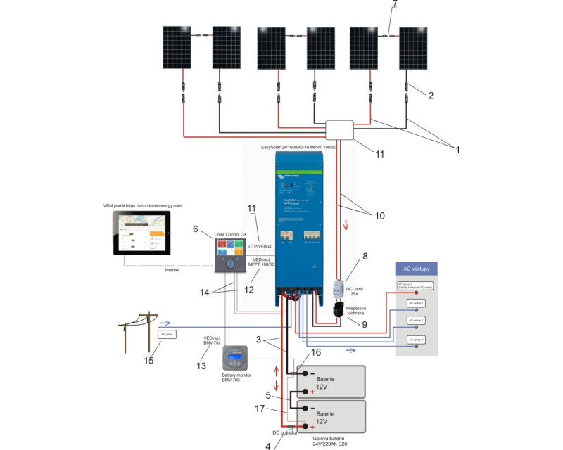 - dle nastavení umožňuje pracovat bez dodávek/s dodávkou solárních přebytků do rozvodné sítě