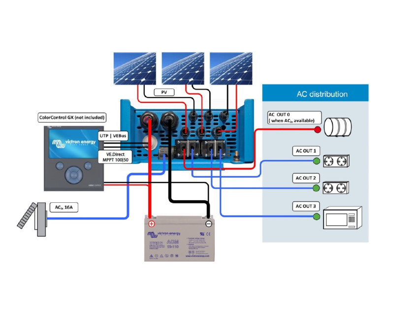 Jde o kompaktní zařízení dva v jednom spojující zařízení měnič/nabíječku (MultiPlus) a solární MPPT regulátor. Měnič/nabíječka odebírá vyrobenou energii přímo ze solárního systému a/nebo energii uloženou v baterii, přeměňuje ji na střídavý proud a napájí připojené 230 V AC spotřebiče. V nejnutnějších případech (viz dále) využívá i energii z distribuční sítě (nebo jiného zdroje, třeba generátoru). Solární MPPT regulátor maximalizuje množství vyrobené energie z fotovoltaických panelů, předává energii měniči/nabíječce pro napájení spotřebičů a přebytky energie ukládá do baterie pro její budoucí využití v době nedostatku solární energie (například v noci).