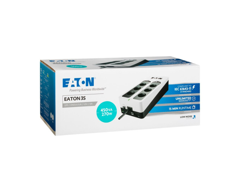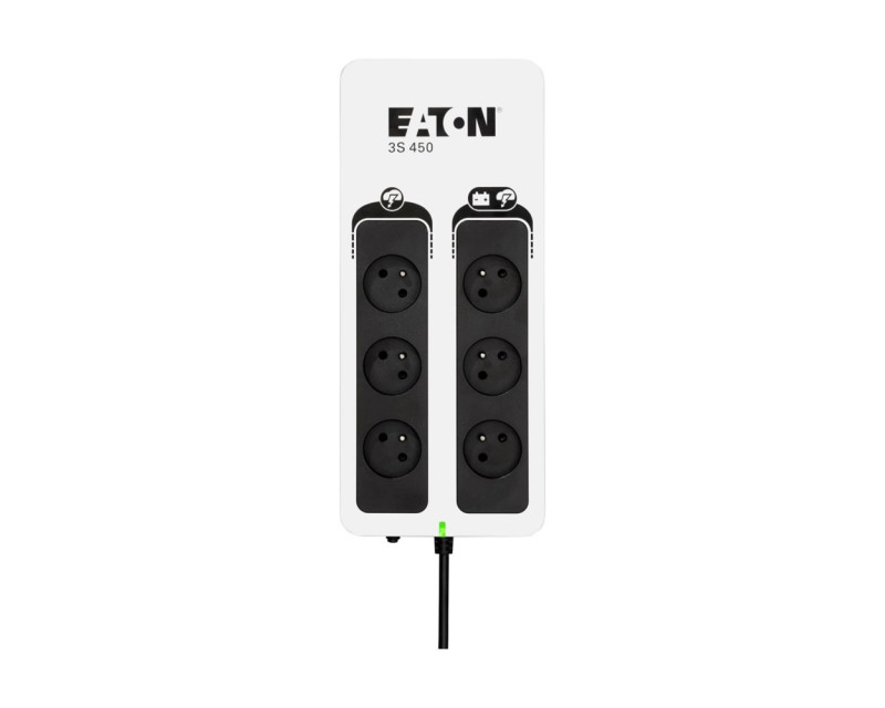 UPS Eaton 3S pomáhá chránit vaši výpočetní techniku v případě výskytu nežádoucích jevů a událostí, jako jsou atmosférické výboje, bouřky, přetížení rozvodné sítě, poruchy a živelné události, způsobující bez předchozího varování výpadky napájení z elektrorozvodné sítě. Při úplném výpadku poskytuje UPS záložní napájení z baterie až třem z šesti připojitelných zařízení. Díky atraktivnímu designu a líbivé povrchové úpravě UPS 3S dokonale zapadne do moderního kancelářského prostředí.