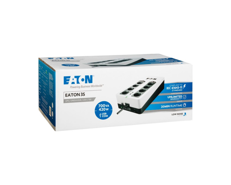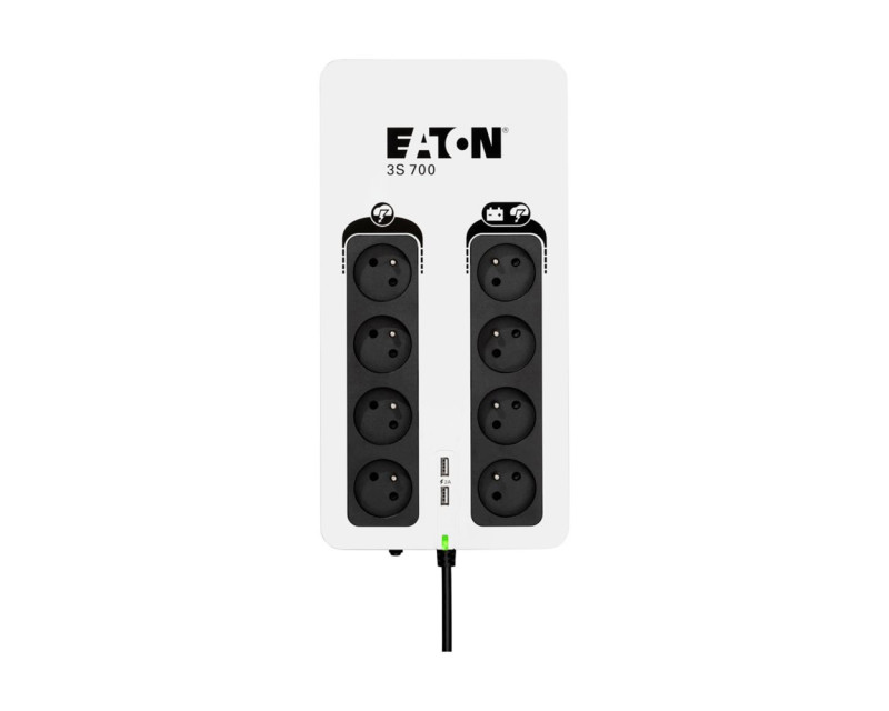 UPS Eaton 3S pomáhá chránit vaši výpočetní techniku v případě výskytu nežádoucích jevů a událostí, jako jsou atmosférické výboje, bouřky, přetížení rozvodné sítě, poruchy a živelné události, způsobující bez předchozího varování výpadky napájení z elektrorozvodné sítě. Při úplném výpadku poskytuje UPS záložní napájení z baterie až třem z šesti připojitelných zařízení. Díky atraktivnímu designu a líbivé povrchové úpravě UPS 3S dokonale zapadne do moderního kancelářského prostředí.