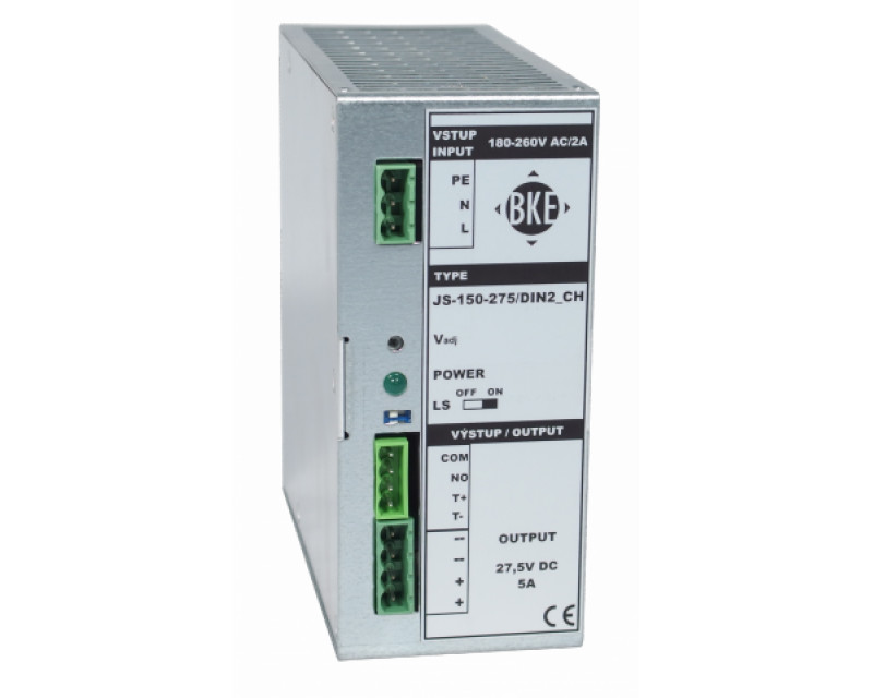 Průmyslový napájecí zdroj/nabíječ Pb akumulátorů na DIN lištu BKE JS-150-138/DIN2_CH_ODP 13,8 V, 150 W, 10 A, spínaný s odpojovačem akumulátoru zabraňující jeho hlubokému vybití a poškození. Zdroj má ochranu proti zkratu a přetížení na výstupu, přepětí a podpětí na výstupu a tepelnou ochranu. Nabíječ je vybaven aktivní kompenzací účiníku (PFC). Zdroj je vhodný pro napájení informační a telekomunikační techniky s možností zálohování DC napětí. Zdroj má účinnost vyšší než 80% a velkou předností je 5 letá záruční doba. Zdroj lze provozovat i bez připojeného akumulátoru.