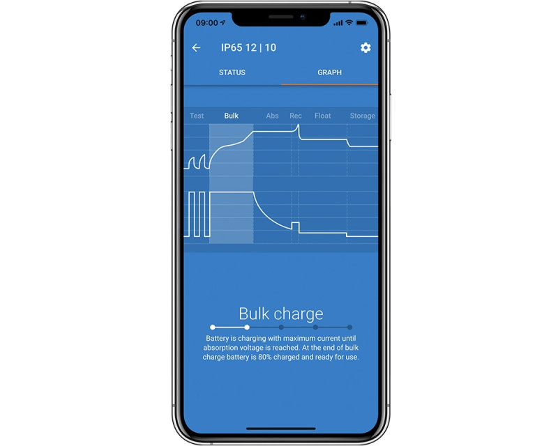Nastavení, zobrazení a konfiguraci Blue Smart IP65 nabíječky můžete prostřednictvím smartphonu. Můžete zobrazit stav nabíječky a baterie. Dokonce ovládat funkce nabíječky pomocí aplikace VictronConnect. Na obrazovce je zobrazena výchozí hodnota napětí a proudu. Stáhnout aplikaci pro iOS a Android můžete zde. Aplikaci VictronConnect si můžete také zdarma stáhnout na Google Play, nebo v App Store. Pro mobilní telefony s operačním systémem Windows tato aplikace zatím není k dispozici.
