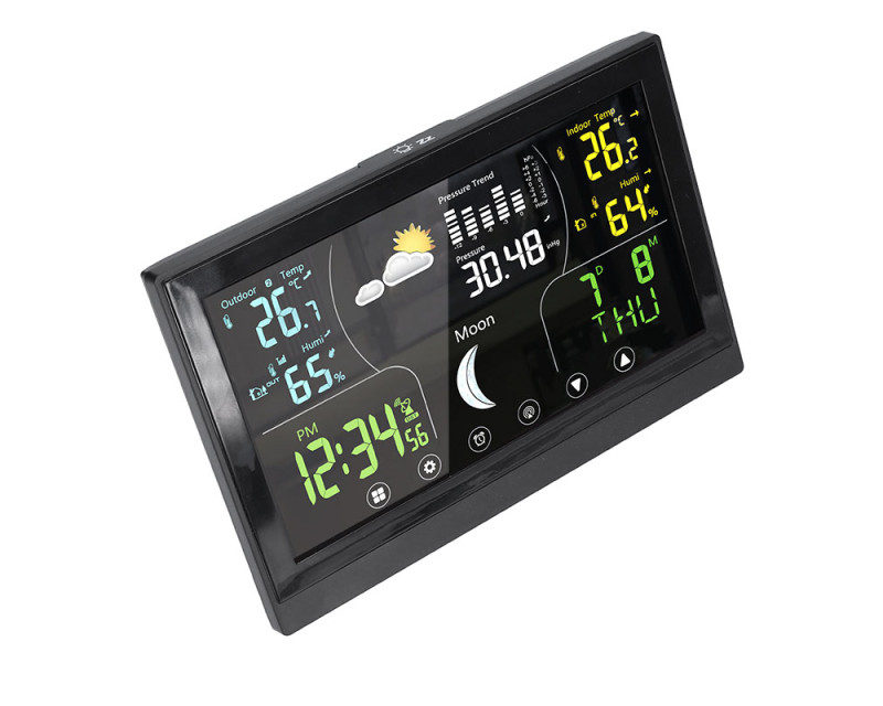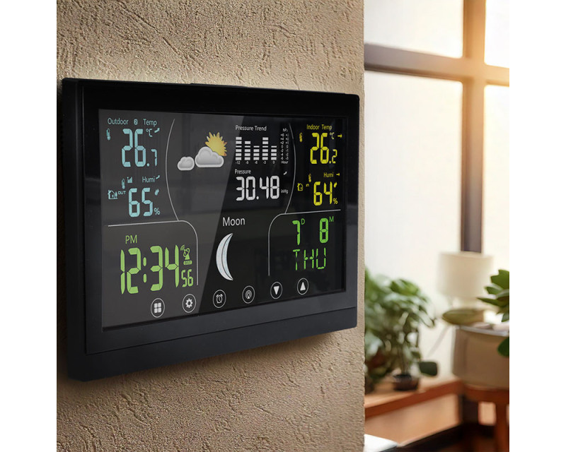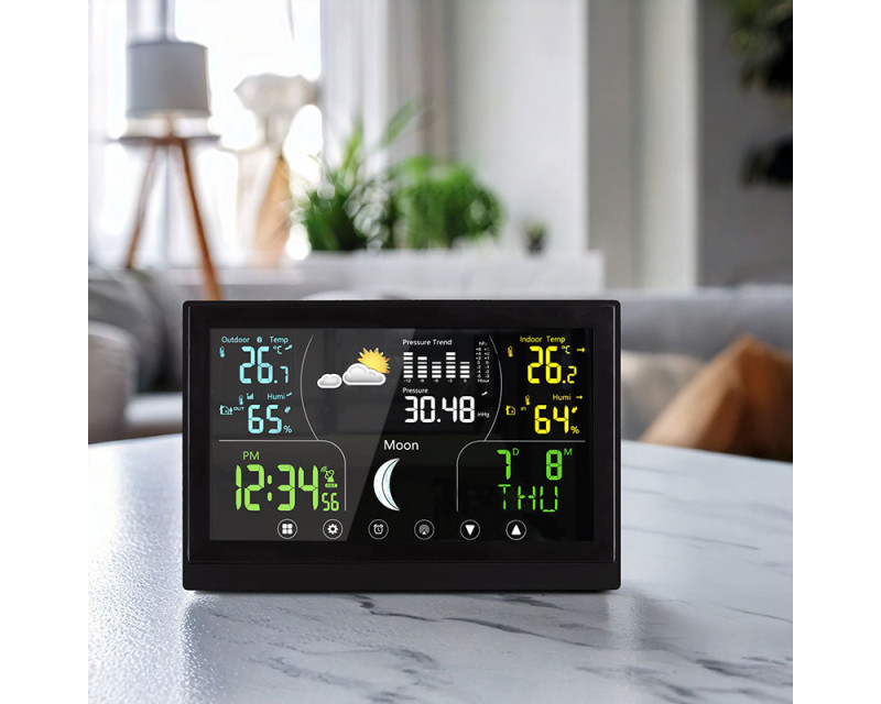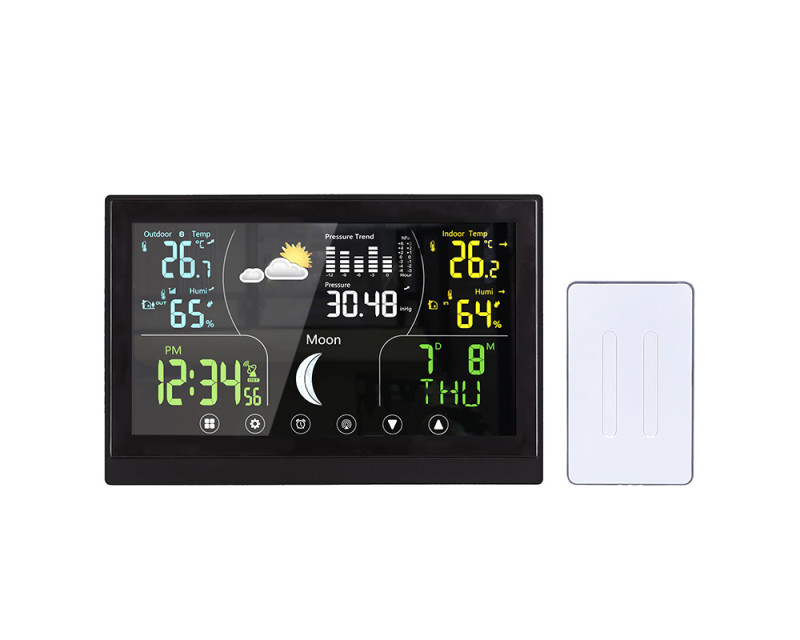 Tato meteostanice nabízí barevný VA displej s dotykovým ovládáním o velikosti 168 × 93 mm, který zajišťuje vynikající čitelnost a intuitivní ovládání. Díky možnosti trvalého podsvícení je zobrazení přehledné i ve tmě. Displej poskytuje širokou škálu informací, včetně aktuální teploty (vnitřní od -10 °C do +50 °C, venkovní od -50 °C do +70 °C), relativní vlhkosti (1 % až 99 % RH), atmosférického tlaku a předpovědi počasí. Kromě toho zobrazuje fáze Měsíce, kalendář, datum a hodiny řízené DCF signálem, což zajišťuje vždy přesný čas. Stanice umožňuje záznam minimálních a maximálních hodnot, nastavení teplotní výstrahy, výběr jednotek teploty (°C/°F) a dokonce korekci nadmořské výšky pro přesnější měření tlaku. Je vybavena funkcí budíku s možností opakovaného buzení, což z ní činí praktického pomocníka nejen pro sledování počasí, ale i pro každodenní použití. Bezdrátové čidlo s dosahem až 100 m (součástí balení) umožňuje přesné měření venkovních podmínek a je možné připojit až tři čidla současně. Napájení hlavní jednotky je možné buď adaptérem (5 V DC/300 mA), nebo třemi AAA bateriemi, zatímco čidlo využívá dvě AAA baterie. Díky kompaktním rozměrům hlavní jednotky (17 × 192 × 127 mm) a elegantnímu černému provedení se hodí do jakéhokoli interiéru a poskytuje moderní a stylový doplněk domácnosti.
