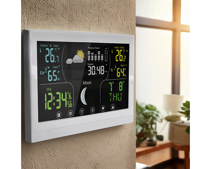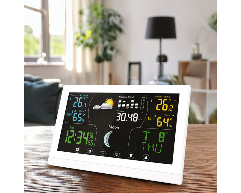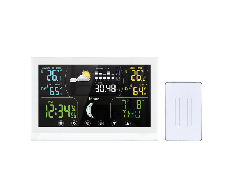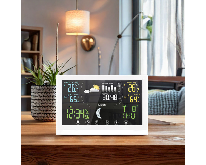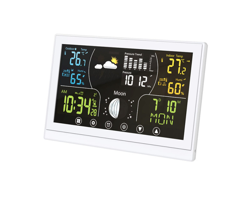 Tato meteostanice nabízí barevný VA displej s dotykovým ovládáním o velikosti 168 × 93 mm, který zajišťuje vynikající čitelnost a intuitivní ovládání. Díky možnosti trvalého podsvícení je zobrazení přehledné i ve tmě. Displej poskytuje širokou škálu informací, včetně aktuální teploty (vnitřní od -10 °C do +50 °C, venkovní od -50 °C do +70 °C), relativní vlhkosti (1 % až 99 % RH), atmosférického tlaku a předpovědi počasí. Kromě toho zobrazuje fáze Měsíce, kalendář, datum a hodiny řízené DCF signálem, což zajišťuje vždy přesný čas. Stanice umožňuje záznam minimálních a maximálních hodnot, nastavení teplotní výstrahy, výběr jednotek teploty (°C/°F) a dokonce korekci nadmořské výšky pro přesnější měření tlaku. Je vybavena funkcí budíku s možností opakovaného buzení, což z ní činí praktického pomocníka nejen pro sledování počasí, ale i pro každodenní použití. Bezdrátové čidlo s dosahem až 100 m (součástí balení) umožňuje přesné měření venkovních podmínek a je možné připojit až tři čidla současně. Napájení hlavní jednotky je možné buď adaptérem (5 V DC/300 mA), nebo třemi AAA bateriemi, zatímco čidlo využívá dvě AAA baterie. Díky kompaktním rozměrům hlavní jednotky (17 × 192 × 127 mm) a elegantnímu bílému provedení se hodí do jakéhokoli interiéru a poskytuje moderní a stylový doplněk domácnosti.
