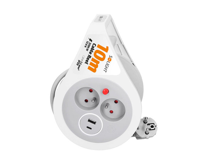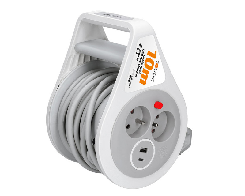 Solight prodlužovací přívod na bubnu 10m, USB A+C, 2 zásuvky, šedý kabel, 3x 1,0mm2