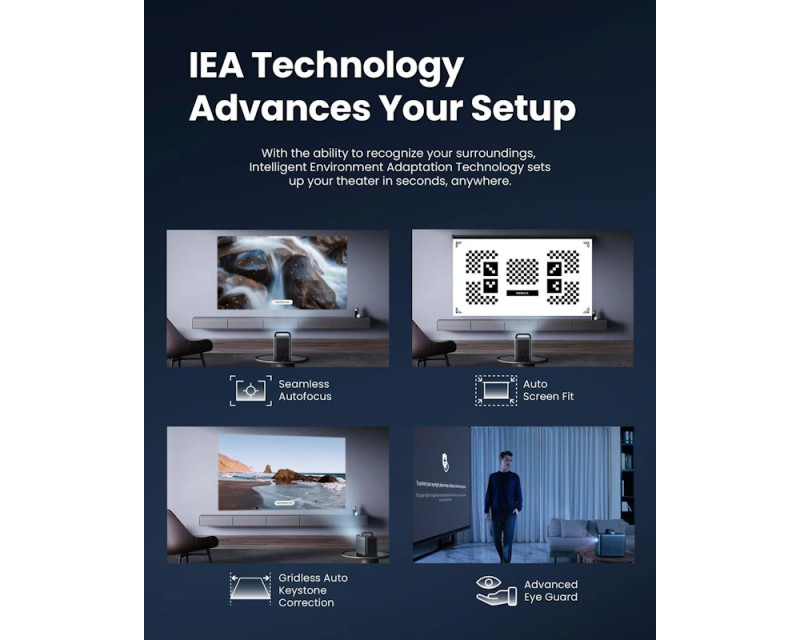 Inteligentní konfigurace IEA 4.0: Cosmos 4K SE se inteligentně přizpůsobí vašemu prostoru díky automatickému zaostřování v reálném čase, lichoběžníkové korekci, automatickému vyhýbání se překážkám, přizpůsobení se obrazovce, barvě stěn, okolnímu osvětlení a dalším funkcím.